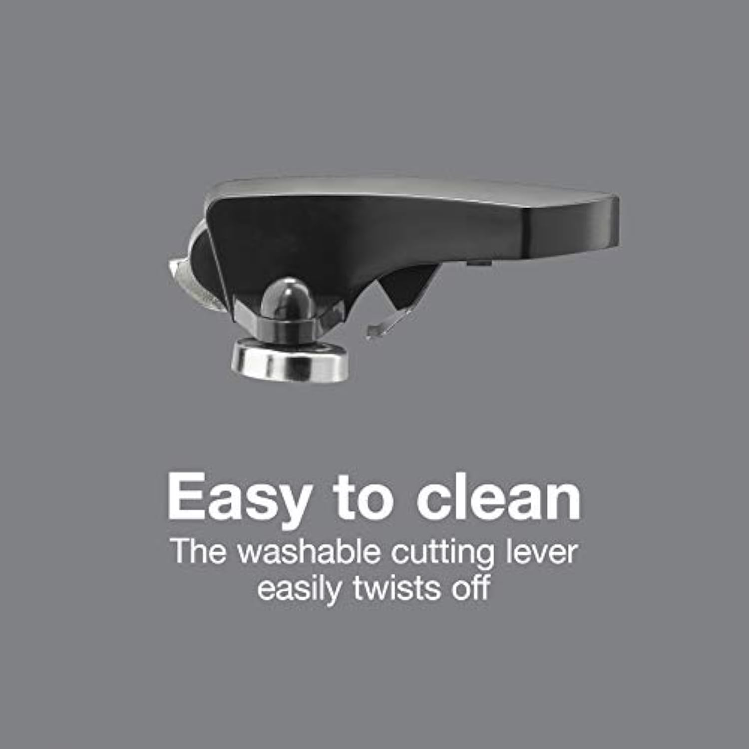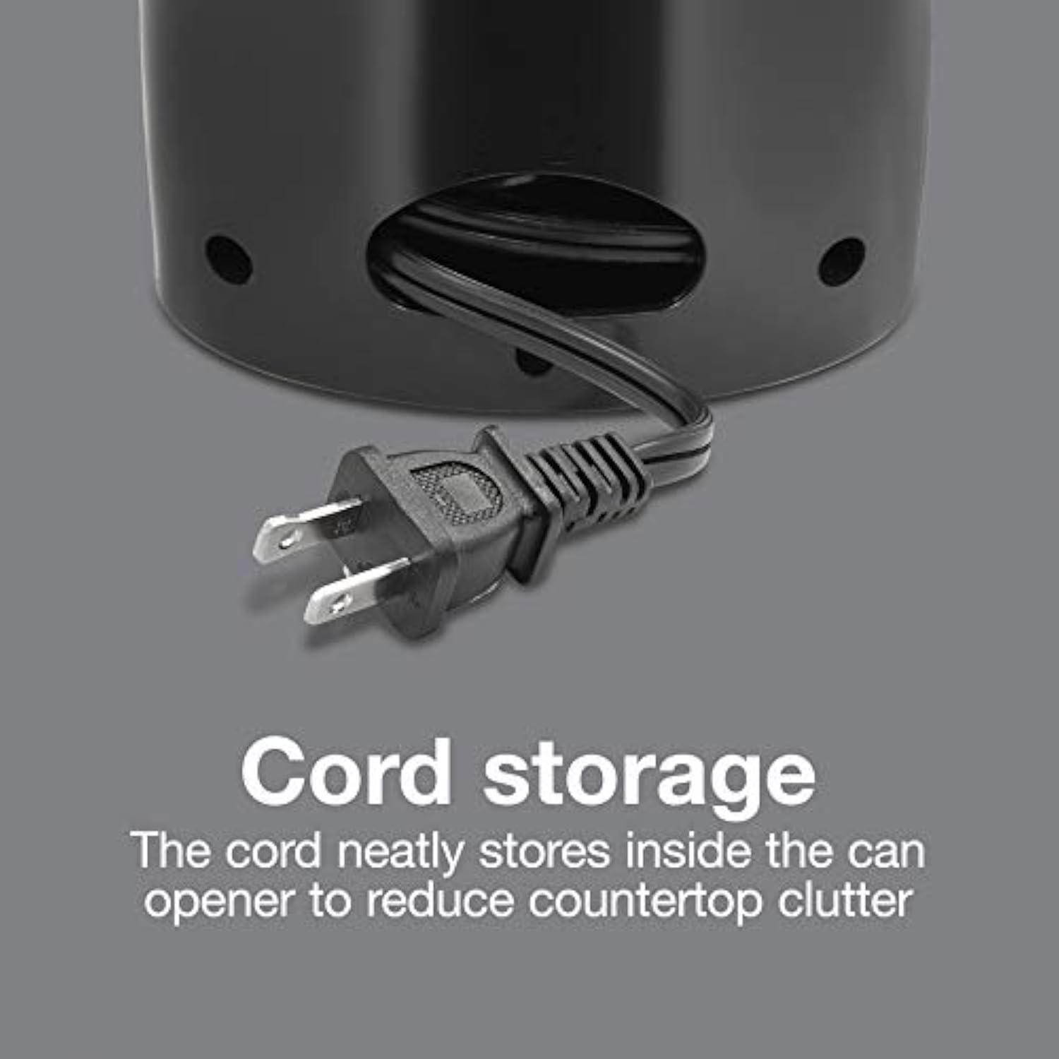 -- Tall enough to open a 7-inch-high can, this electric can opener is as practical as it is stylish. It has a knife sharpener in the rear as well as push-in cord storage, allowing for tidiness on the counter. The cutting lever removes for easy cleanup. Clad in gleaming black plastic, the opener measures 8-7/8 inches high, 4-1/4 inches wide at the base, and 3-1/2 inches deep. When operating, a magnet flips down and grips the top of the can, then lifts it off when the can is removed. --Fred Brack Product Description Important tools like Can openers should be reliable and save you time and energy in the kitchen. Proctor Silex can openers are powerful enough for even the toughest jobs and are sized to open extra-tall cans. These popular can openers are essential for today's busy family and provide solid cutting performance every can openers are designed for convenience, and the cutting lever can be removed for quick and easy cleanup. Whether you need an affordable can opener for under the cabinet or on the countertop, these reliable appliances are easy to use and look great in your kitchen.