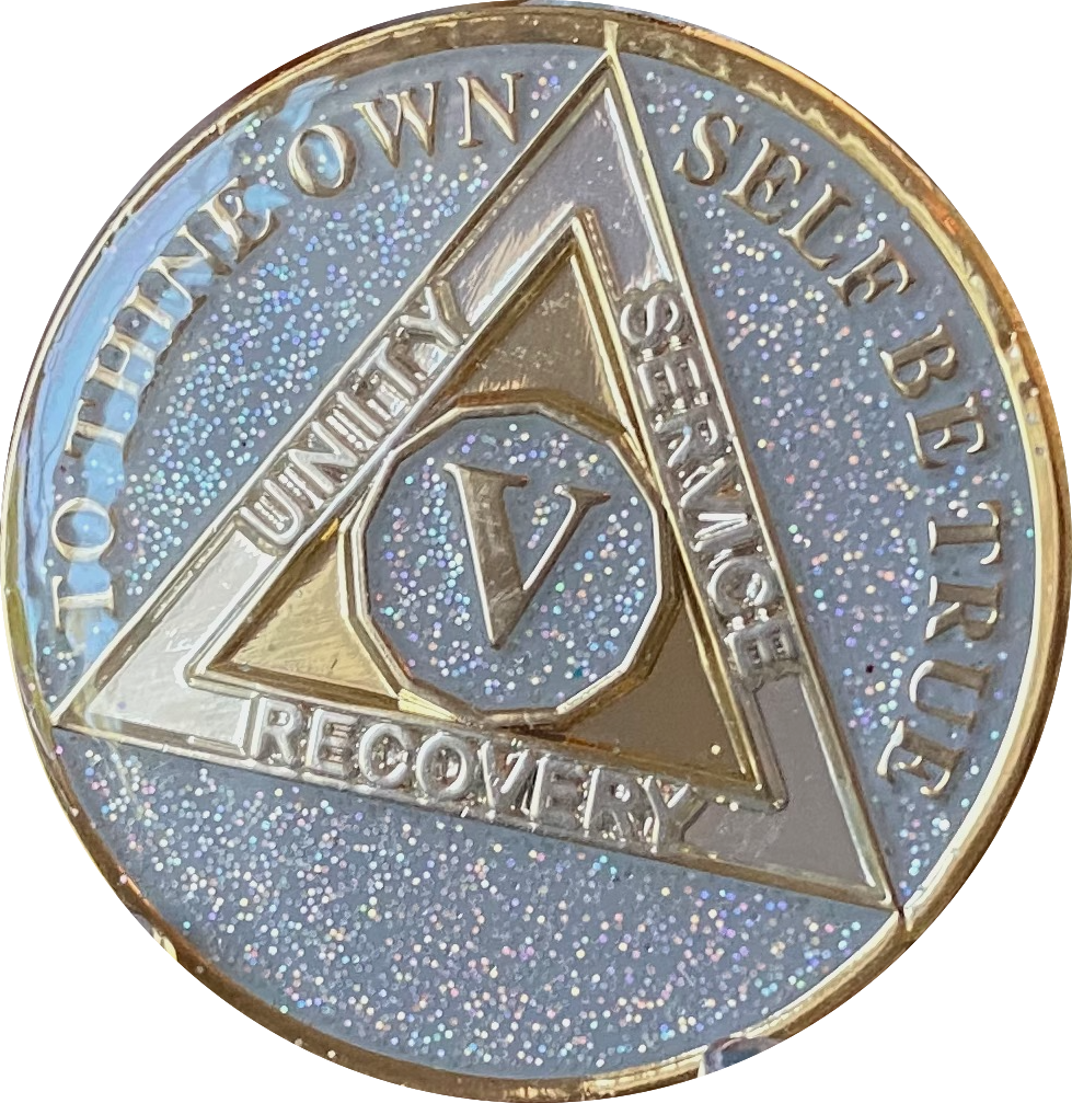 5 Year AA Medallion Opal Silver Glitter Tri-Plate Sobriety Chip