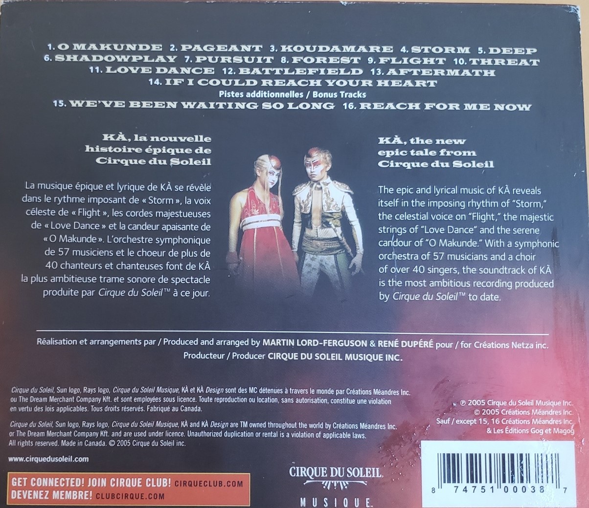 Ka - Cirque Du Soleil. Music by Rene Dupere. With a symphonic orchestra of 57 musicians and a choir of over 40 singers, this soundtrack of Ka is the most ambitious recording produced by Cirque Du Soleil to date.
