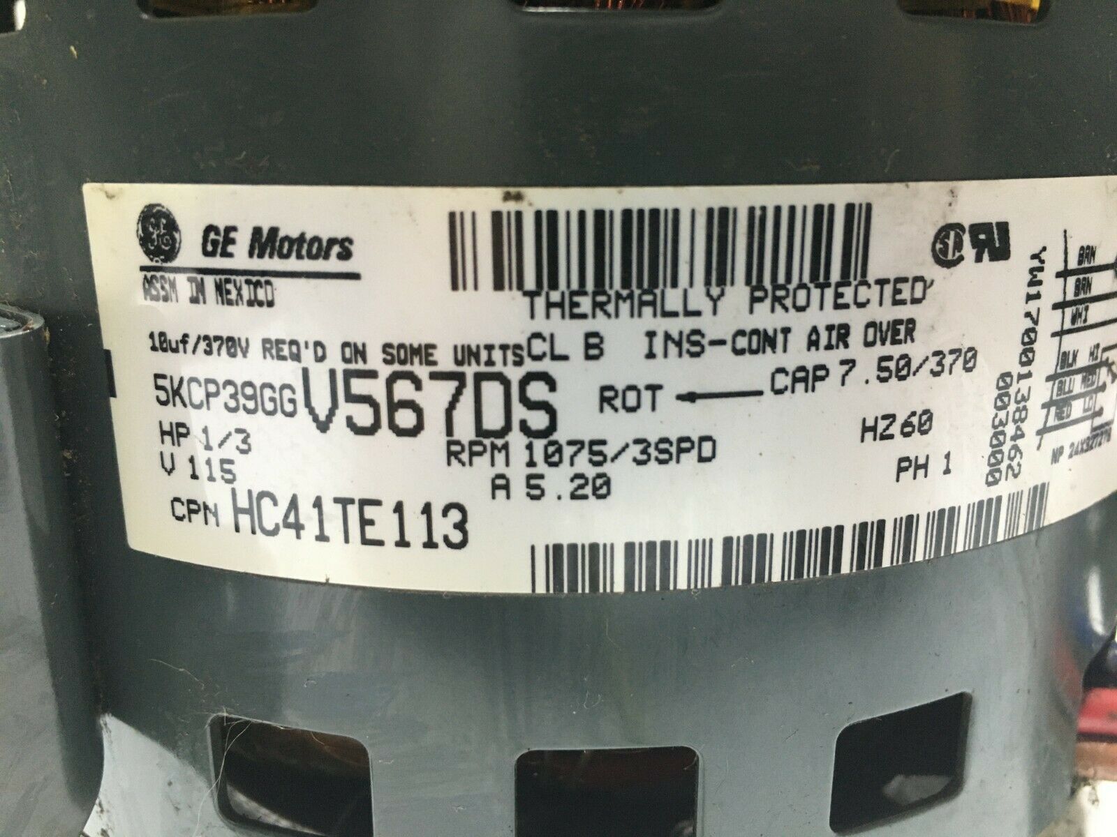 This is GE Motors 5KCP39GGV567DS Blower Motor 1/3HP 1075RPM 3SPD 115V HC41TE113 used part.