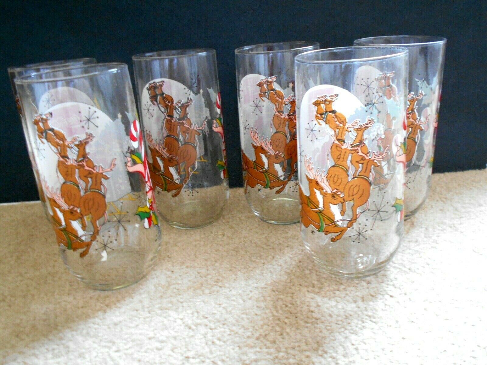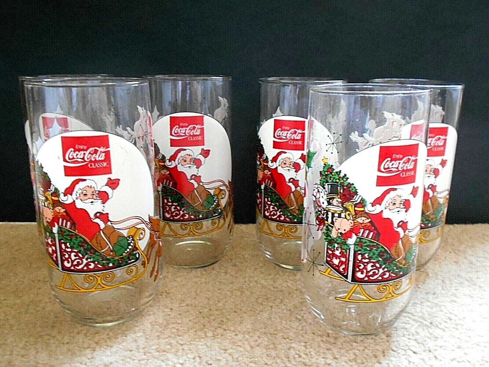 Set of 6 Coca Cola Classic Santa in Slay pulled by Reindeer 8 oz. Glasses