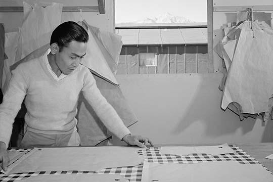 20inch x 30inch Poster Bert K. Miura, half-length portrait, standing, looking down, placing pattern on fabric. Ansel Easton Adams (1902 ?? 1984) was an American photographer, best known for his black-and-white photographs of the American West. During part of his career, he was hired by the US Government to record life in the West. - There is a border around the image. Image size is correct.