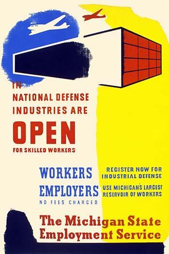 20inch x 30inch Poster In national defense industries are open for skilled workers Workers - register now for industrial defense : Employers - use Michigan's largest reservoir of workers : The Michigan State Employment Service. Michigan Art Craft Project, WPA. Poster announcing employment opportunities for skilled industrial laborers in Michigan. - There is a border around the image. Image size is correct.