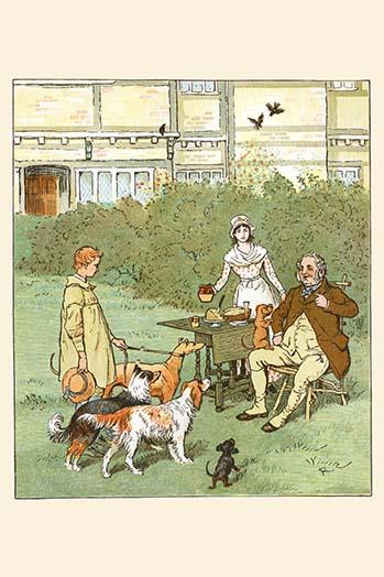 20inch x 30inch Poster Dogs come to eat by the farmer's table along with the Shepherd boy - There is a border around the image. Image size is correct.