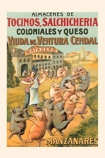 20inch x 30inch Poster Spanish adversiting poster for a slaughterhouse and store for pork products and cheese. "Almacenes de tocinos, salchicheria coloniales y queso. Viuda de ventura cendal." - There is a border around the image. Image size is correct.