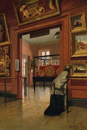 20inch x 30inch Poster Convinced that tradition should shape the skills of American artists and the standards of their patrons, Waller endeavored to improve art instruction and applauded new museums such as the Metropolitan, which opened in 1870. He sets this scene in the Metropolitan's second home, the Douglas Mansion on West Fourteenth Street, which it occupied from 1873 to 1879. Waller presents a woman as the archetypal female devotee of art and culture, thus expressing women's association with civilizing pastimes. He portrays two second-floor galleries as they appeared in 1879, when the portrait??then attributed to Leonardo??on view in the far room was on loan. Henry Peters Gray's Wages of War (1848), the Metropolitan's first American acquisition, is installed above the doorway. - There is a border around the image. Image size is correct.