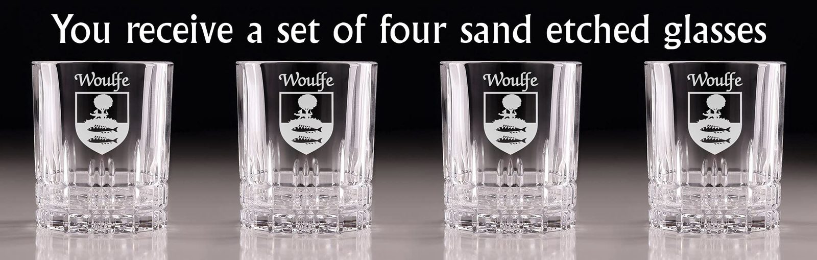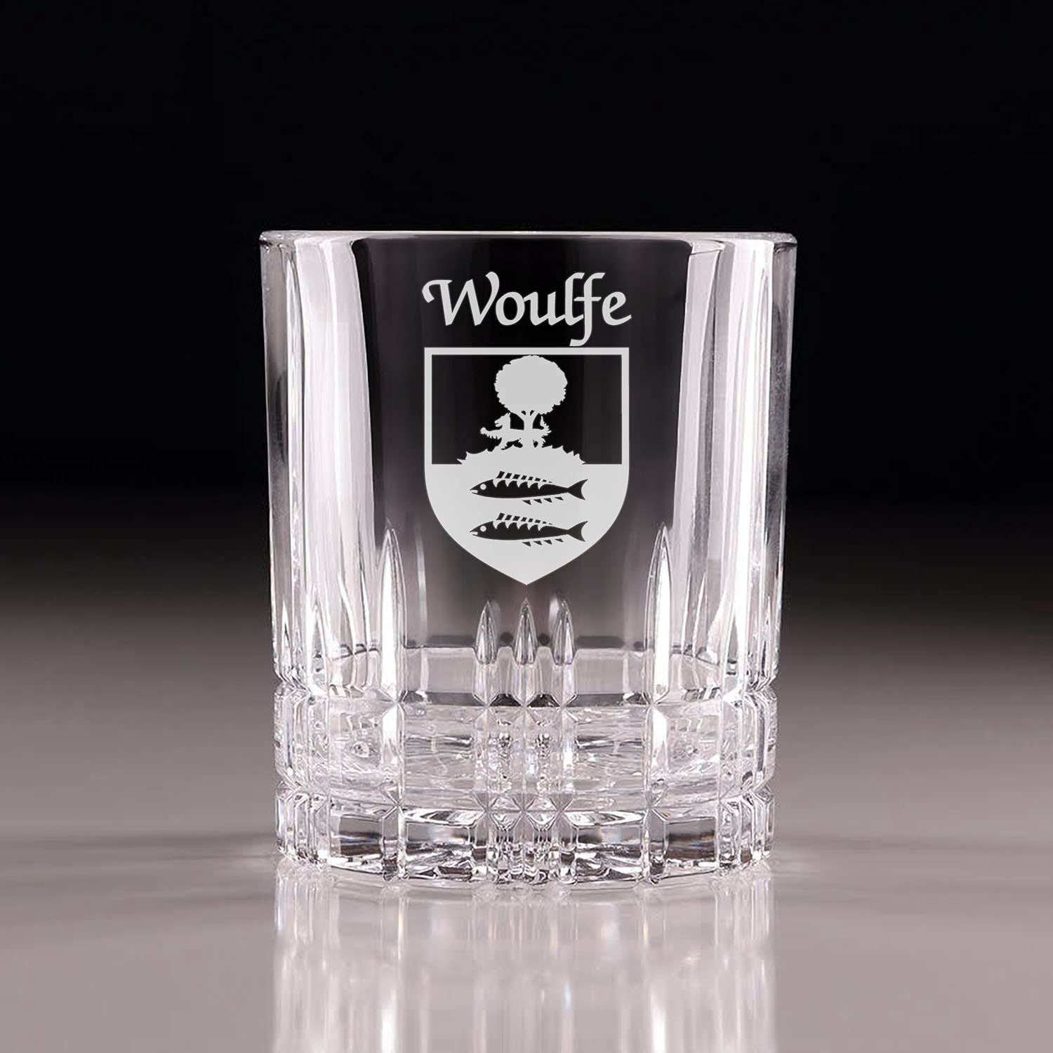 Product description: Woulfe Irish Coat of Arms Cut Glass Tumblers - Set of 4. Pour your favorite beverage and enjoy it in luxury! These Spiegelau Perfect Serve double old fashioned glasses are the perfect way to elevate your home glassware! Featuring an elegant retro, cut-glass design and your very own Irish Coat of Arms expertly hand-sandblasted onto each tumbler, this glass is sure to impress! Made with Spiegleau's unique Platinum Glass process to eliminate imperfections in the glass, they're thick-walled, heavy weighted, and crystal clear!