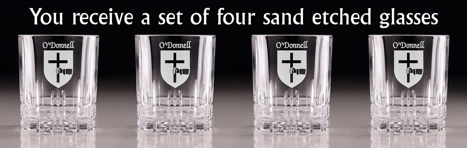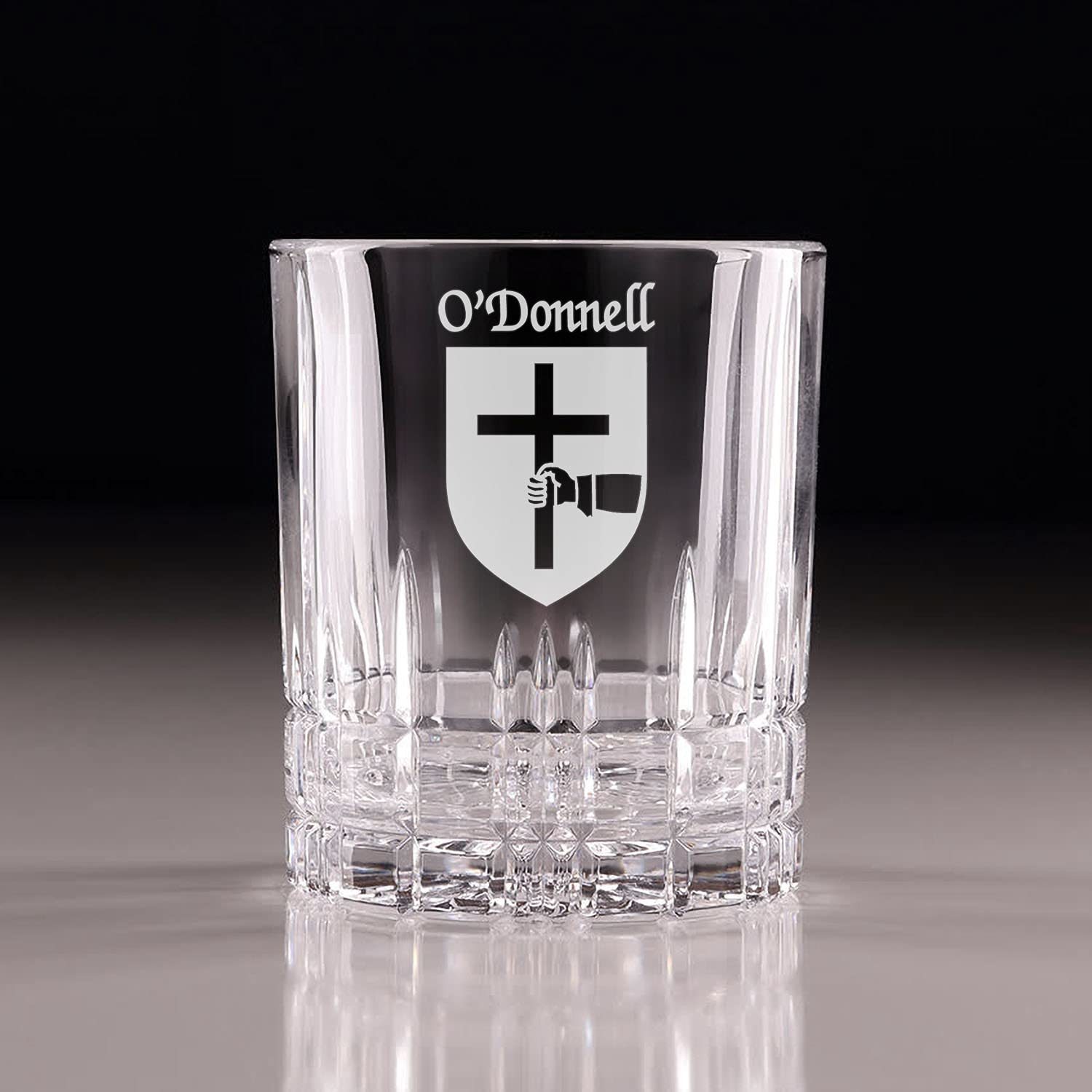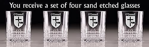 Product description: O'Donnell Irish Coat of Arms Cut Glass Tumblers - Set of 4. Pour your favorite beverage and enjoy it in luxury! These Spiegelau Perfect Serve double old fashioned glasses are the perfect way to elevate your home glassware! Featuring an elegant retro, cut-glass design and your very own Irish Coat of Arms expertly hand-sandblasted onto each tumbler, this glass is sure to impress! Made with Spiegleau's unique Platinum Glass process to eliminate imperfections in the glass, they're thick-walled, heavy weighted, and crystal clear!