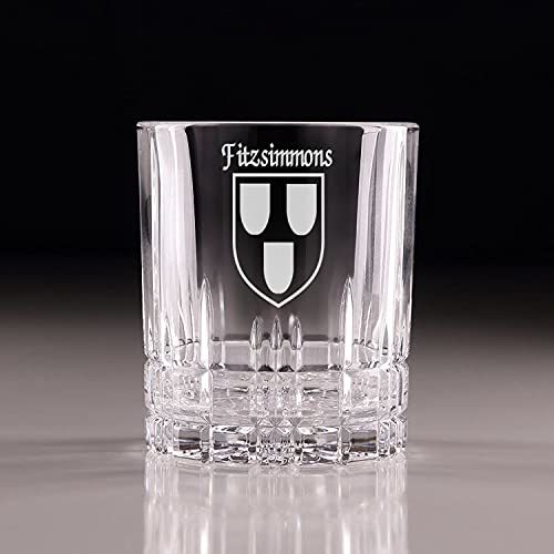 Fitzsimmons Irish Coat of Arms Cut Glass Tumblers - Set of 4. Pour your favorite beverage and enjoy it in luxury! These Spiegelau Perfect Serve double old fashioned glasses are the perfect way to elevate your home glassware! Featuring an elegant retro, cut-glass design and your very own Irish Coat of Arms expertly hand-sandblasted onto each tumbler, this glass is sure to impress! Made with Spiegleau's unique Platinum Glass process to eliminate imperfections in the glass, they're thick-walled, heavy weighted, and crystal clear!