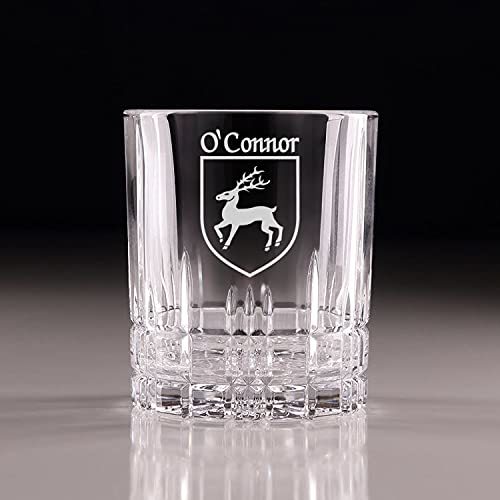 O'Connor(Cork) Irish Coat of Arms Cut Glass Tumblers - Set of 4. Pour your favorite beverage and enjoy it in luxury! These Spiegelau Perfect Serve double old fashioned glasses are the perfect way to elevate your home glassware! Featuring an elegant retro, cut-glass design and your very own Irish Coat of Arms expertly hand-sandblasted onto each tumbler, this glass is sure to impress! Made with Spiegleau's unique Platinum Glass process to eliminate imperfections in the glass, they're thick-walled, heavy weighted, and crystal clear!