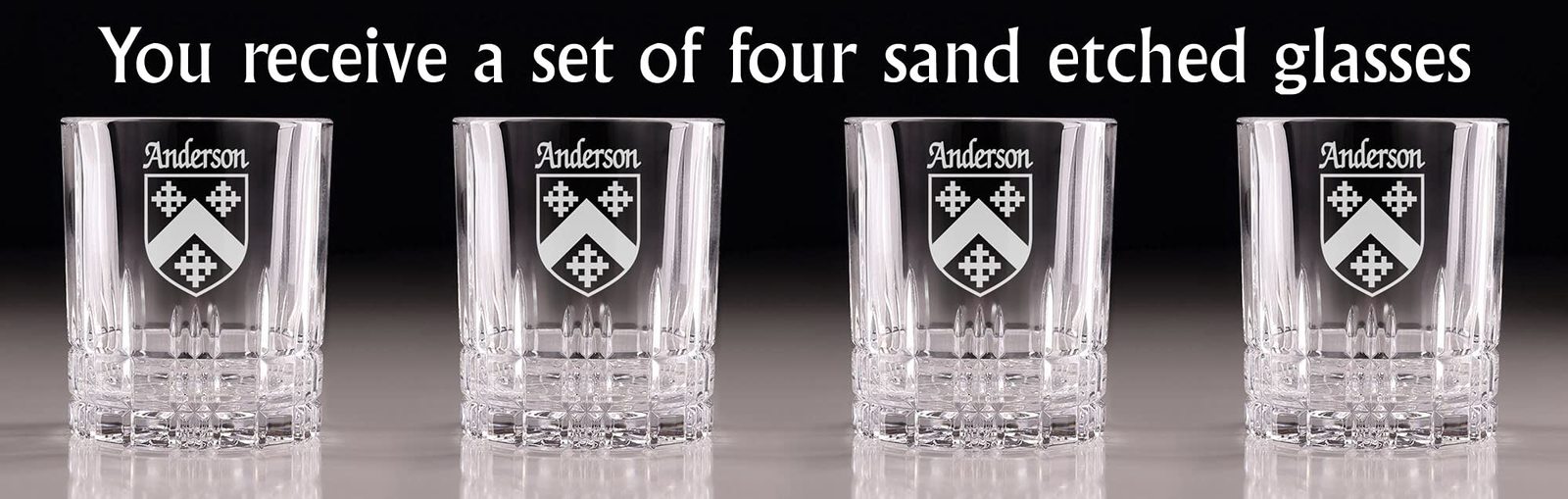 Anderson Irish Coat of Arms Cut Glass Tumblers - Set of 4. Pour your favorite beverage and enjoy it in luxury! These Spiegelau Perfect Serve double old fashioned glasses are the perfect way to elevate your home glassware! Featuring an elegant retro, cut-glass design and your very own Irish Coat of Arms expertly hand-sandblasted onto each tumbler, this glass is sure to impress! Made with Spiegleau's unique Platinum Glass process to eliminate imperfections in the glass, they're thick-walled, heavy weighted, and crystal clear!