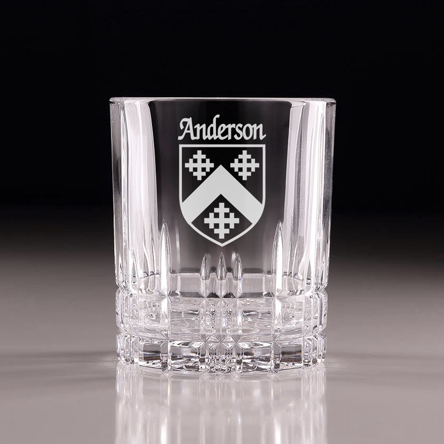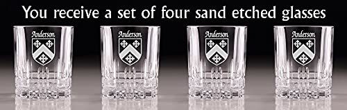 Product description: Anderson Irish Coat of Arms Cut Glass Tumblers - Set of 4. Pour your favorite beverage and enjoy it in luxury! These Spiegelau Perfect Serve double old fashioned glasses are the perfect way to elevate your home glassware! Featuring an elegant retro, cut-glass design and your very own Irish Coat of Arms expertly hand-sandblasted onto each tumbler, this glass is sure to impress! Made with Spiegleau's unique Platinum Glass process to eliminate imperfections in the glass, they're thick-walled, heavy weighted, and crystal clear!