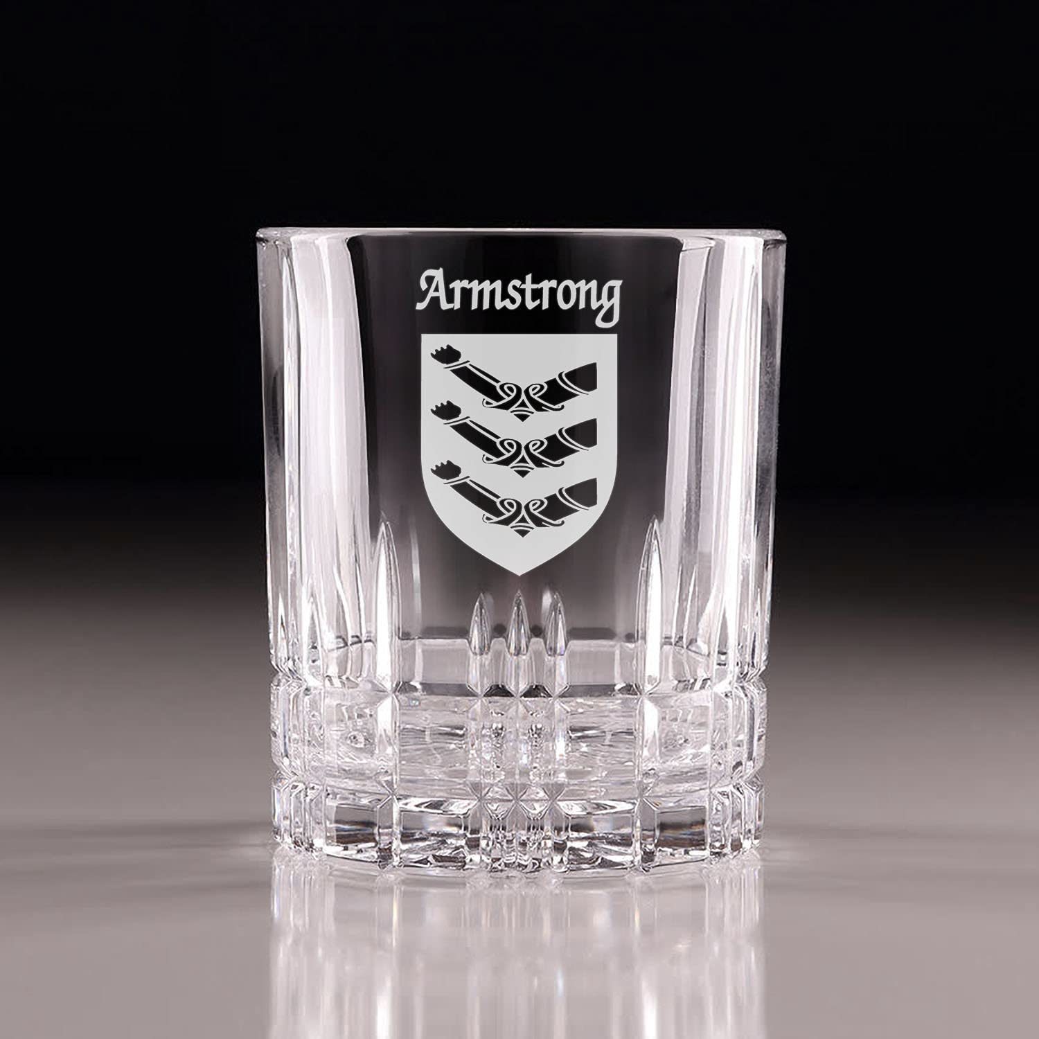 Armstrong Irish Coat of Arms Cut Glass Tumblers - Set of 4. Pour your favorite beverage and enjoy it in luxury! These Spiegelau Perfect Serve double old fashioned glasses are the perfect way to elevate your home glassware! Featuring an elegant retro, cut-glass design and your very own Irish Coat of Arms expertly hand-sandblasted onto each tumbler, this glass is sure to impress! Made with Spiegleau's unique Platinum Glass process to eliminate imperfections in the glass, they're thick-walled, heavy weighted, and crystal clear!