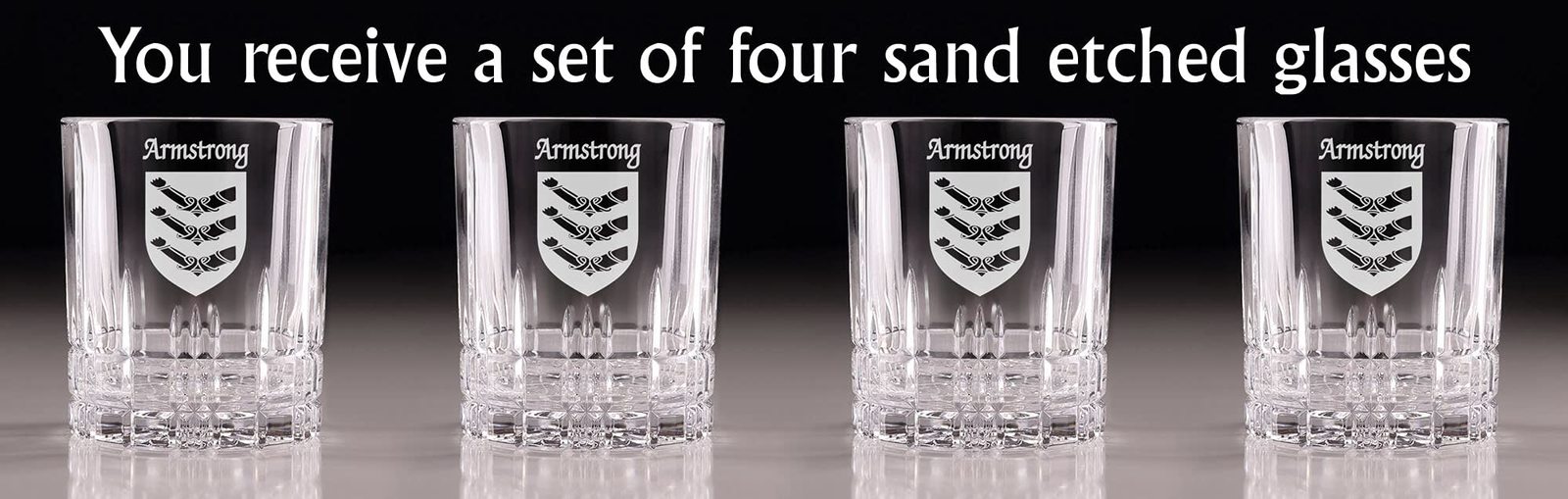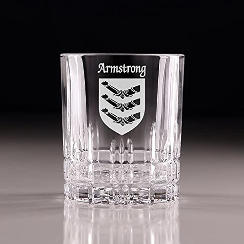 Product description: Armstrong Irish Coat of Arms Cut Glass Tumblers - Set of 4. Pour your favorite beverage and enjoy it in luxury! These Spiegelau Perfect Serve double old fashioned glasses are the perfect way to elevate your home glassware! Featuring an elegant retro, cut-glass design and your very own Irish Coat of Arms expertly hand-sandblasted onto each tumbler, this glass is sure to impress! Made with Spiegleau's unique Platinum Glass process to eliminate imperfections in the glass, they're thick-walled, heavy weighted, and crystal clear!