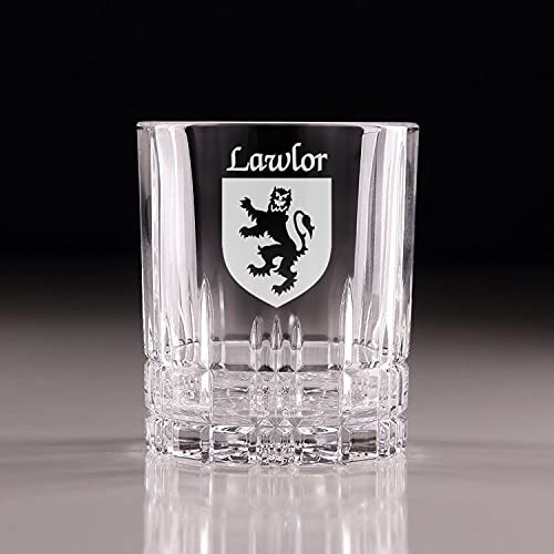 Product description: Lawlor Irish Coat of Arms Cut Glass Tumblers - Set of 4. Pour your favorite beverage and enjoy it in luxury! These Spiegelau Perfect Serve double old fashioned glasses are the perfect way to elevate your home glassware! Featuring an elegant retro, cut-glass design and your very own Irish Coat of Arms expertly hand-sandblasted onto each tumbler, this glass is sure to impress! Made with Spiegleau's unique Platinum Glass process to eliminate imperfections in the glass, they're thick-walled, heavy weighted, and crystal clear!