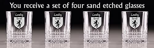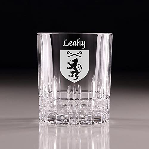 Leahy Irish Coat of Arms Cut Glass Tumblers - Set of 4. Pour your favorite beverage and enjoy it in luxury! These Spiegelau Perfect Serve double old fashioned glasses are the perfect way to elevate your home glassware! Featuring an elegant retro, cut-glass design and your very own Irish Coat of Arms expertly hand-sandblasted onto each tumbler, this glass is sure to impress! Made with Spiegleau's unique Platinum Glass process to eliminate imperfections in the glass, they're thick-walled, heavy weighted, and crystal clear!