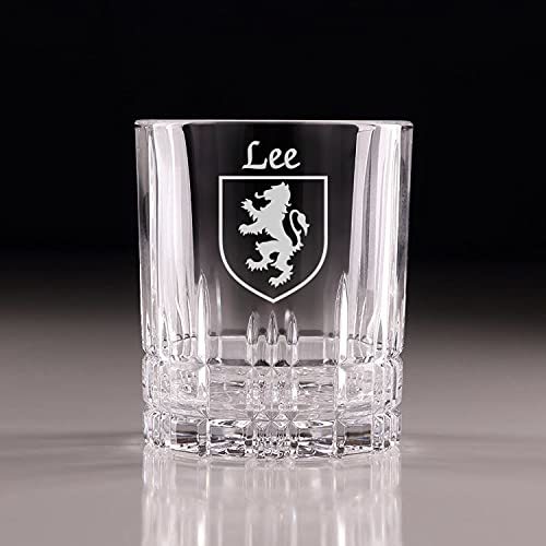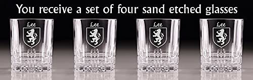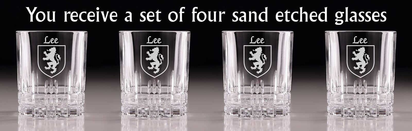 Lee Irish Coat of Arms Cut Glass Tumblers - Set of 4. Pour your favorite beverage and enjoy it in luxury! These Spiegelau Perfect Serve double old fashioned glasses are the perfect way to elevate your home glassware! Featuring an elegant retro, cut-glass design and your very own Irish Coat of Arms expertly hand-sandblasted onto each tumbler, this glass is sure to impress! Made with Spiegleau's unique Platinum Glass process to eliminate imperfections in the glass, they're thick-walled, heavy weighted, and crystal clear!