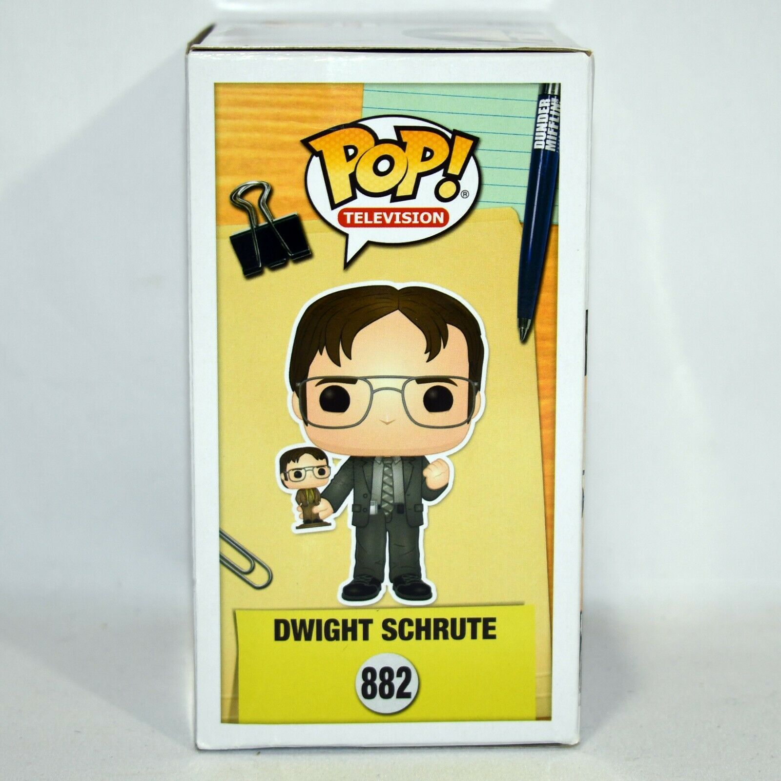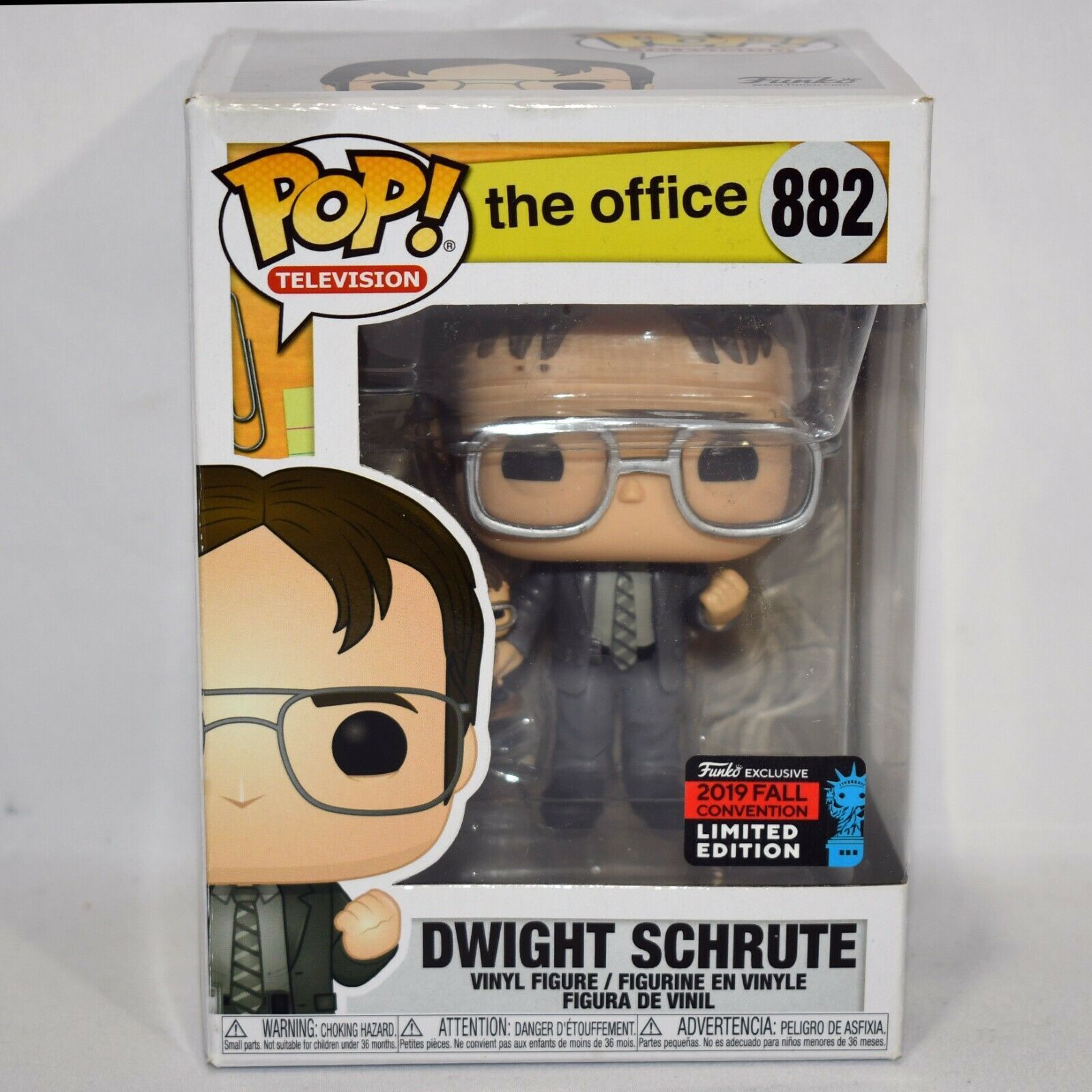 The Office Dwight Schrute Funko Pop NYCC Exclusive NY Comic Con #882! Found this at a thrift store so I marked it as opened but I don't really know if it ever has been, I just figured best be safe! Looks to be in great condition as you can tell by the photos! There looks to be 2 stains on the top left corner and edge as shown in the photos. Please see other photos as all sales are final! Add this rare piece to your collection today!!!