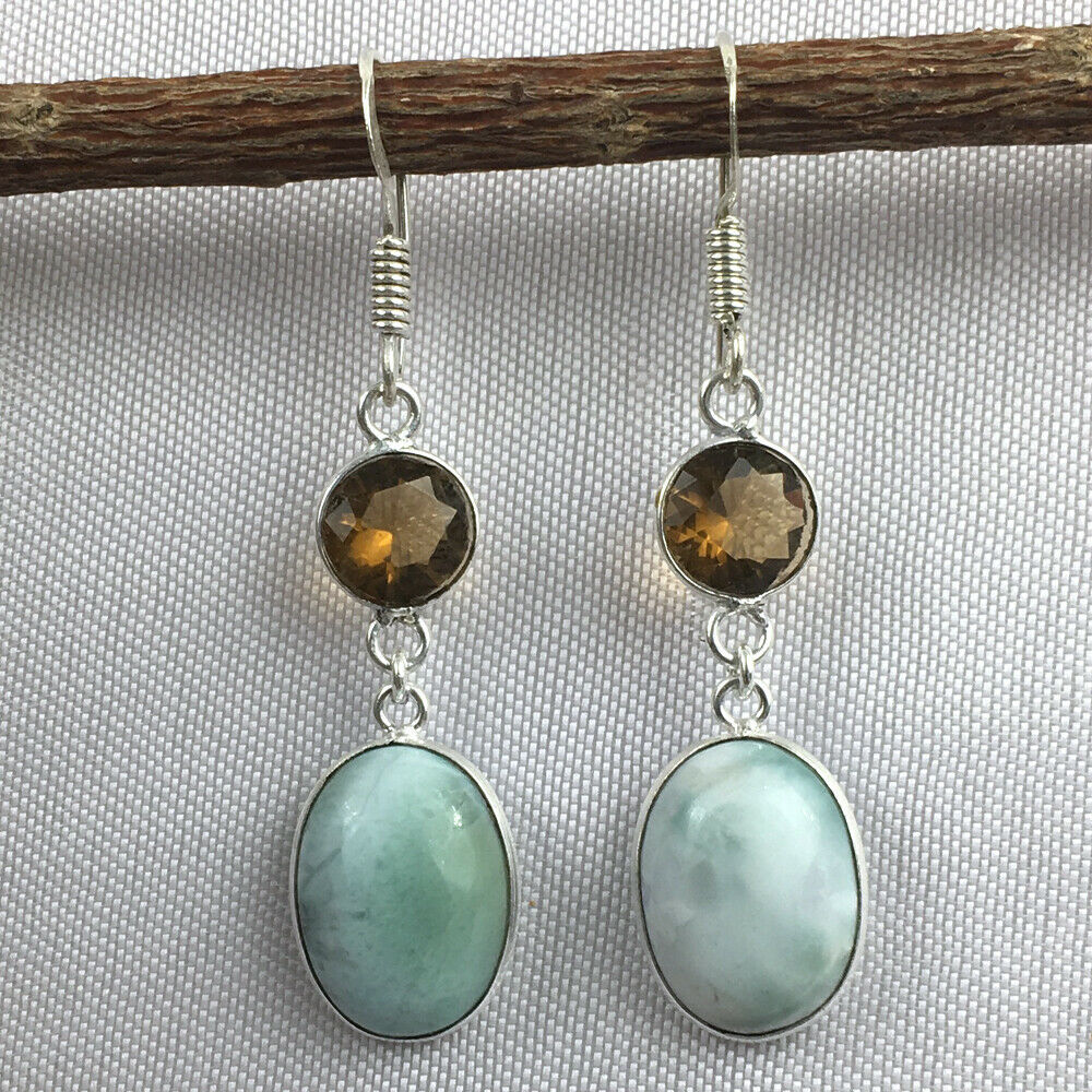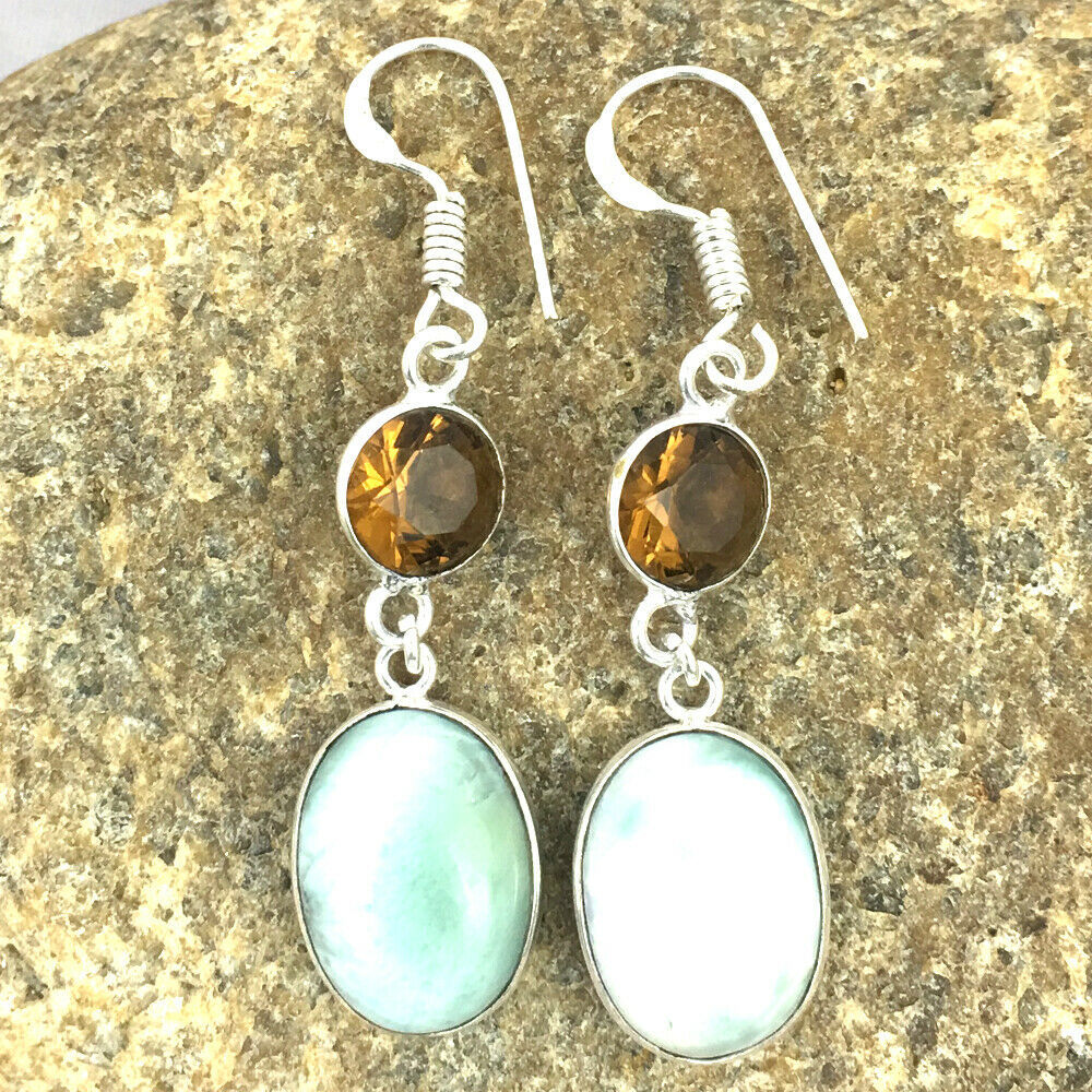 925 Sterling Silver Handmad Larimar & Citrine Bezel Earrings Gift Women BES-1131