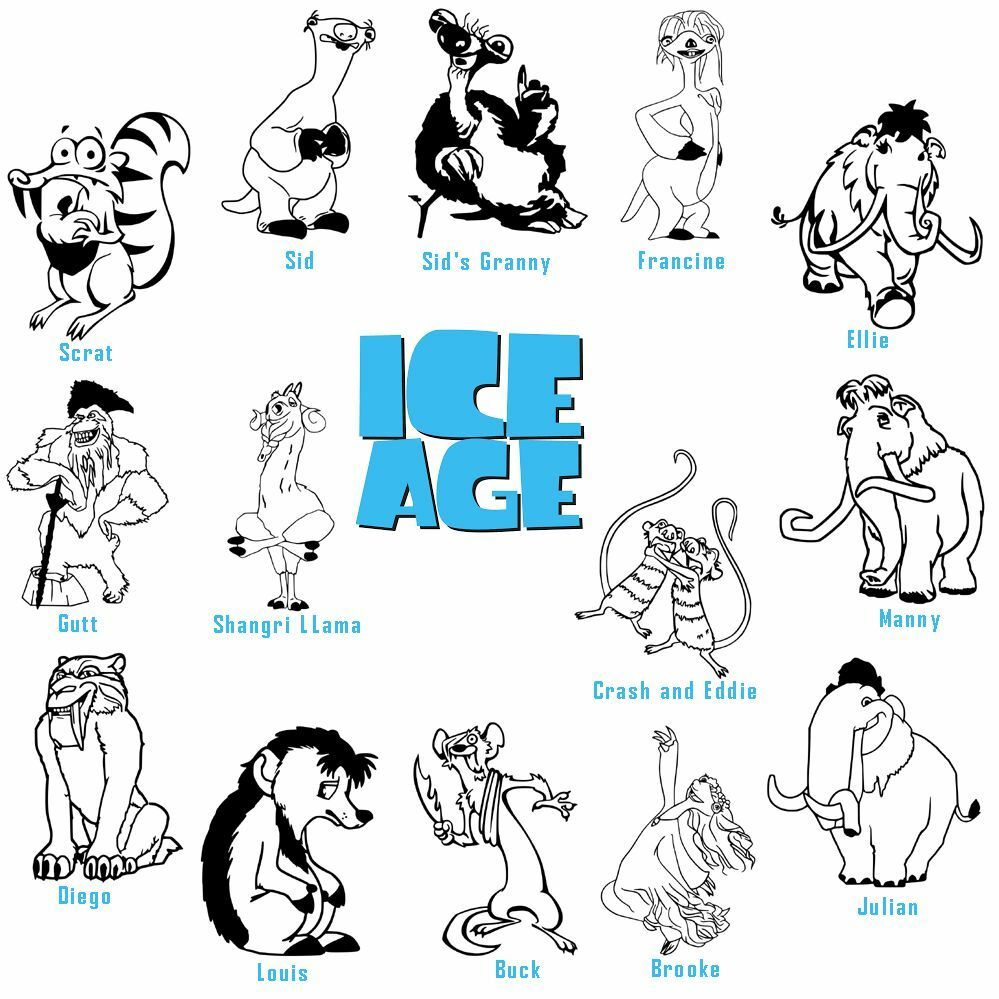 Designs: Design: Scrat, Sid, Sid's Granny, Francine, Ellie, Manny, Julian, Brooke, Buck, Louis, Diego, Gutt, Shangri Llama, Crash and Eddie