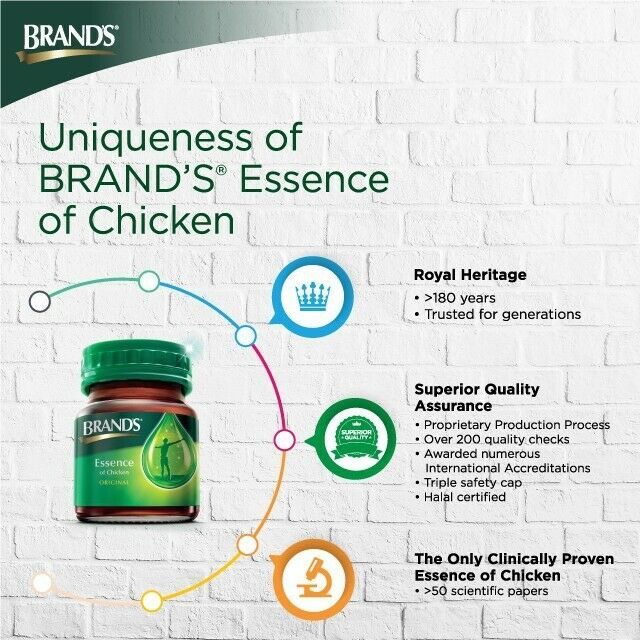 The BRANDSlegacy started in year 1835 when Henderson William Brand, the royal chef of Buckingham Palace London, created a fat-free, easily digested chicken consomme that later became a huge commercial success widely recognized as BRANDSEssence of Chicken. For over 170 years, BRANDSEsssence of Chicken has been widely trusted all over the world for generations. BRANDSEssence of Chicken is the only essence of chicken in the market with extensive R D that has produced more than 20 published scientific papers proving its efficacy. The findings show that consuming BRANDSEssence of Chicken improves mental concentration and memory, a fact concurred and supported by independent scientists.