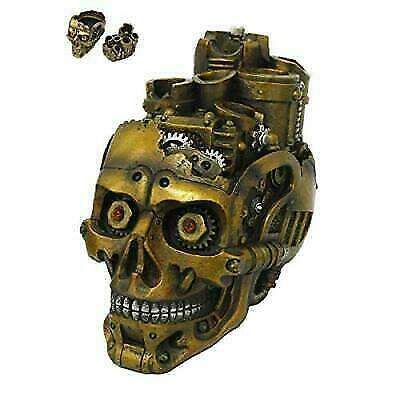 This steampunk skull mad max series features intricate pipework, gearwork, clockwork ion technology jam packed into the ultra cool sculpture. The skull has a red screw nuts and bolts pair of eyes and painted in rusted bronze to give it a vintage look. The skull also has a discreet stash storage compartment which has a lid comprised of the pipelines and channels of a steampunk nautilus submarine.