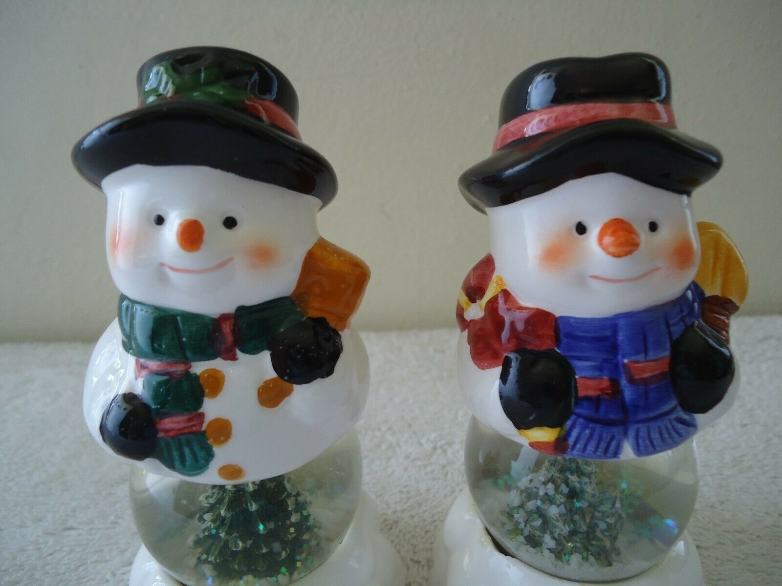 Here is a " NWOT " Holiday Seasons Snowmen Water Globe Salt Pepper Shaker Set " BEAUTIFUL COLLECTIBLE DISPLAYABLE SET ".This is a must for any collector,or decorator wanting that vintage retro look.If you have any concerns or questions about this item(s) please ask before bidding / purchasing because this item(s) is being SOLD AS IS.Thank You.-(PC72T)