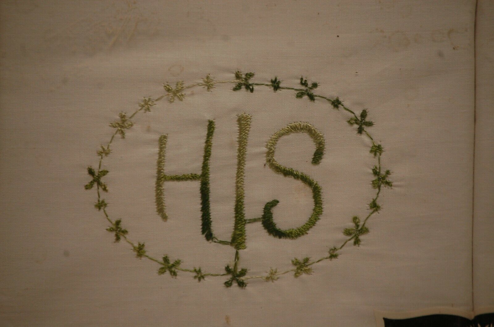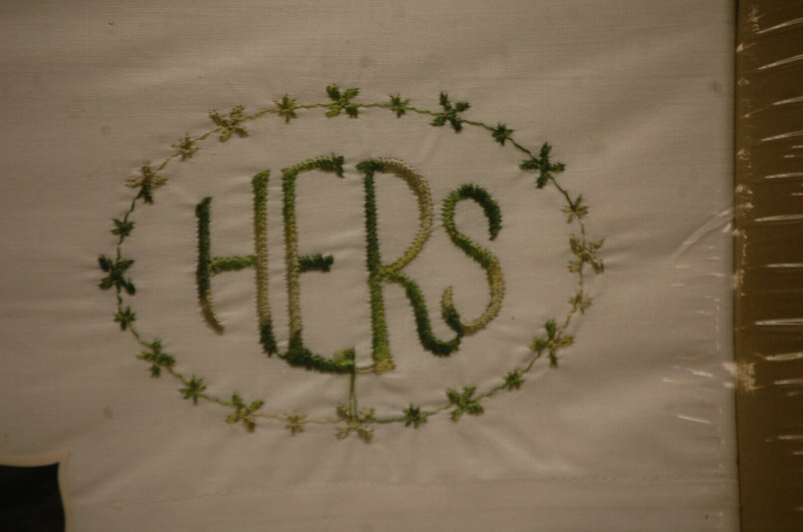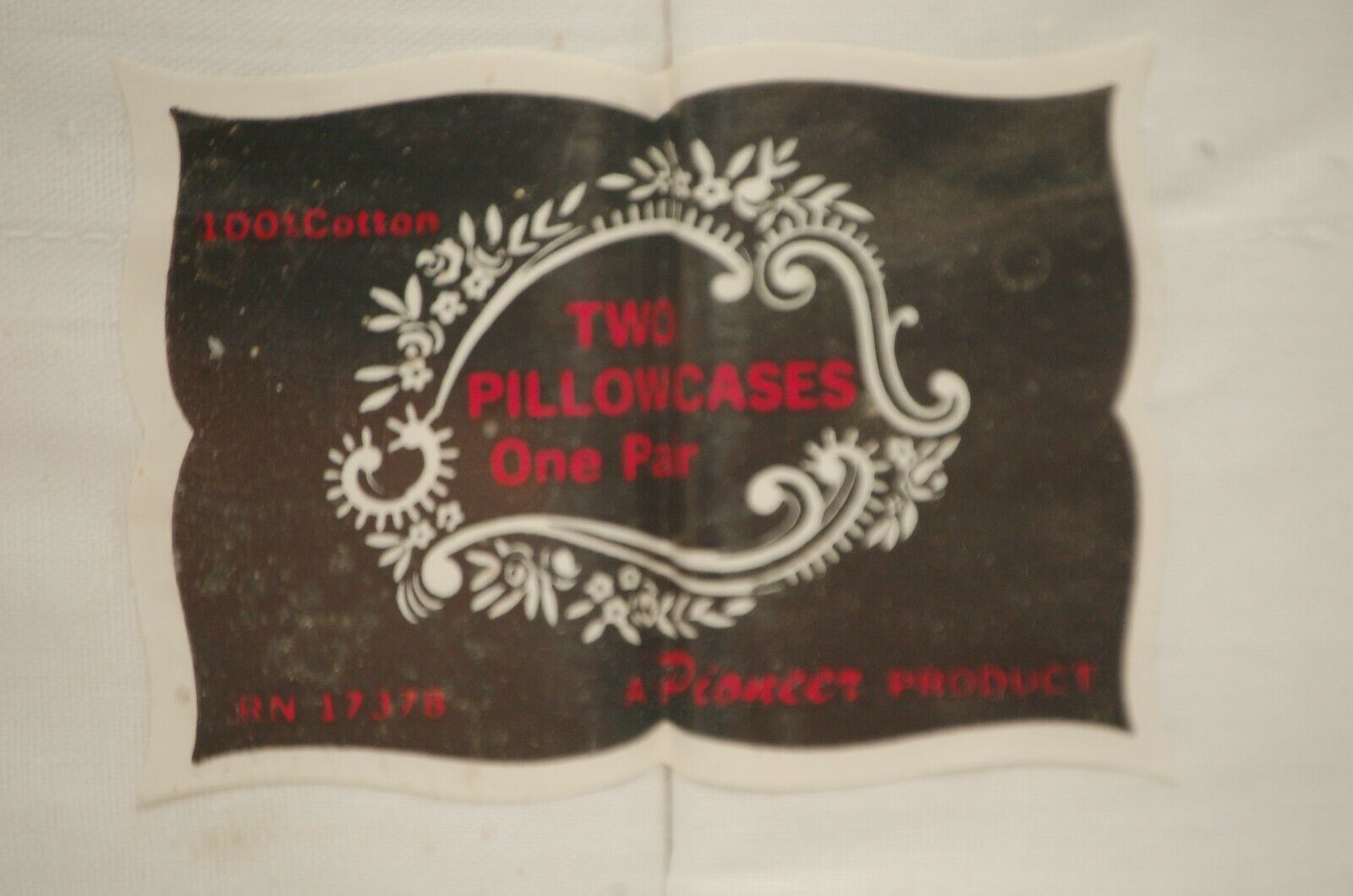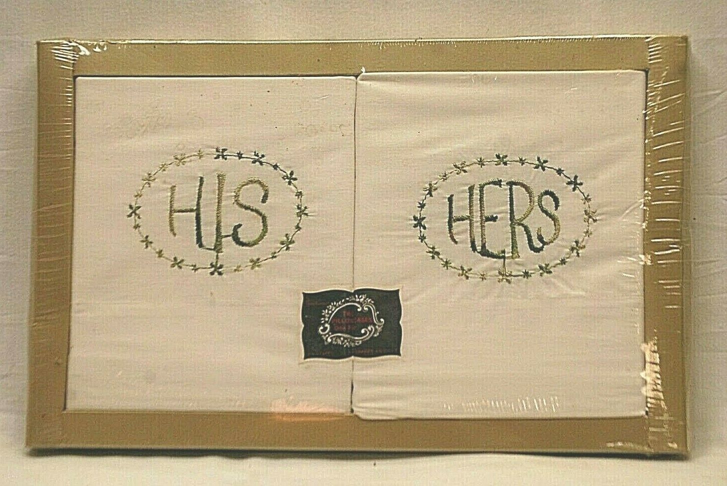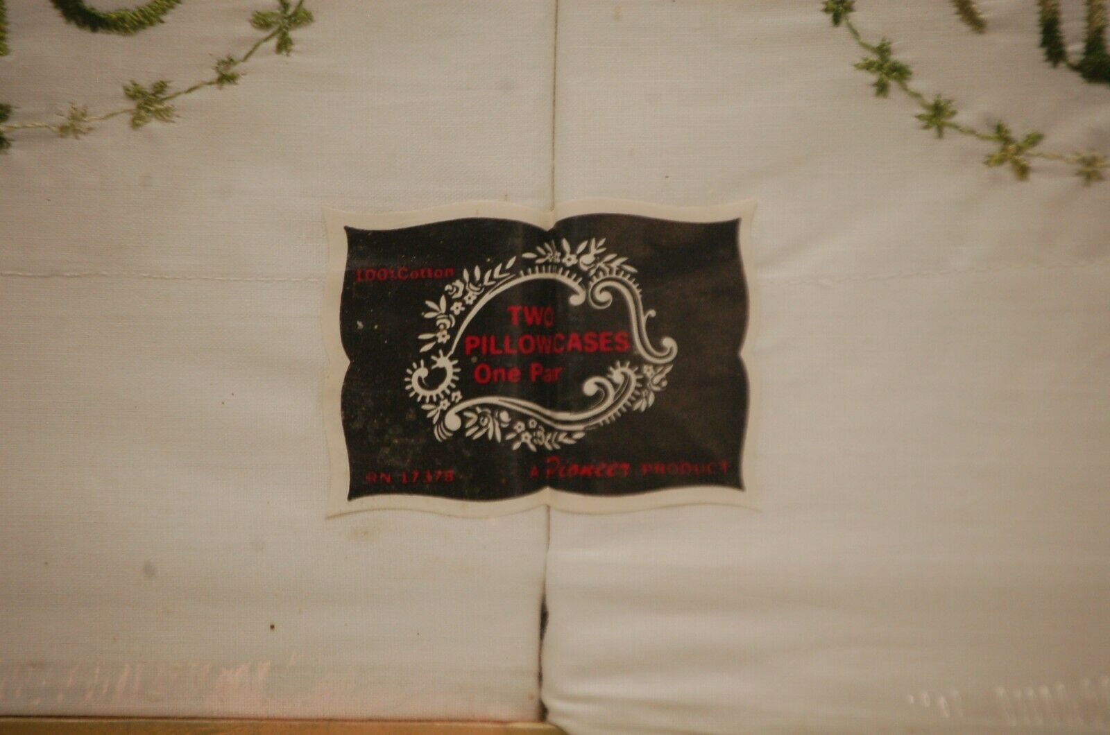 Pioneer Two Standard Pillow Cases Monogram His & Hers White Green Vintage NOS