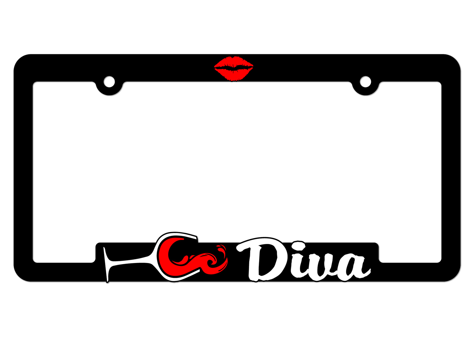 One 3D Raised Letter โWine Divaโ Plastic (polyethylene) License Plate Black Frames, White Red Raised Wine Glass Letters. Retaining Tabs located in lower portion of frame to secure license plate. As with any license plate frame, please ensure this frame style will not conceal DMV/State required content.