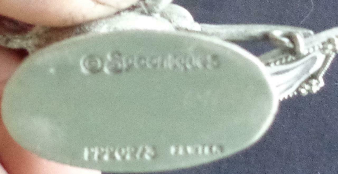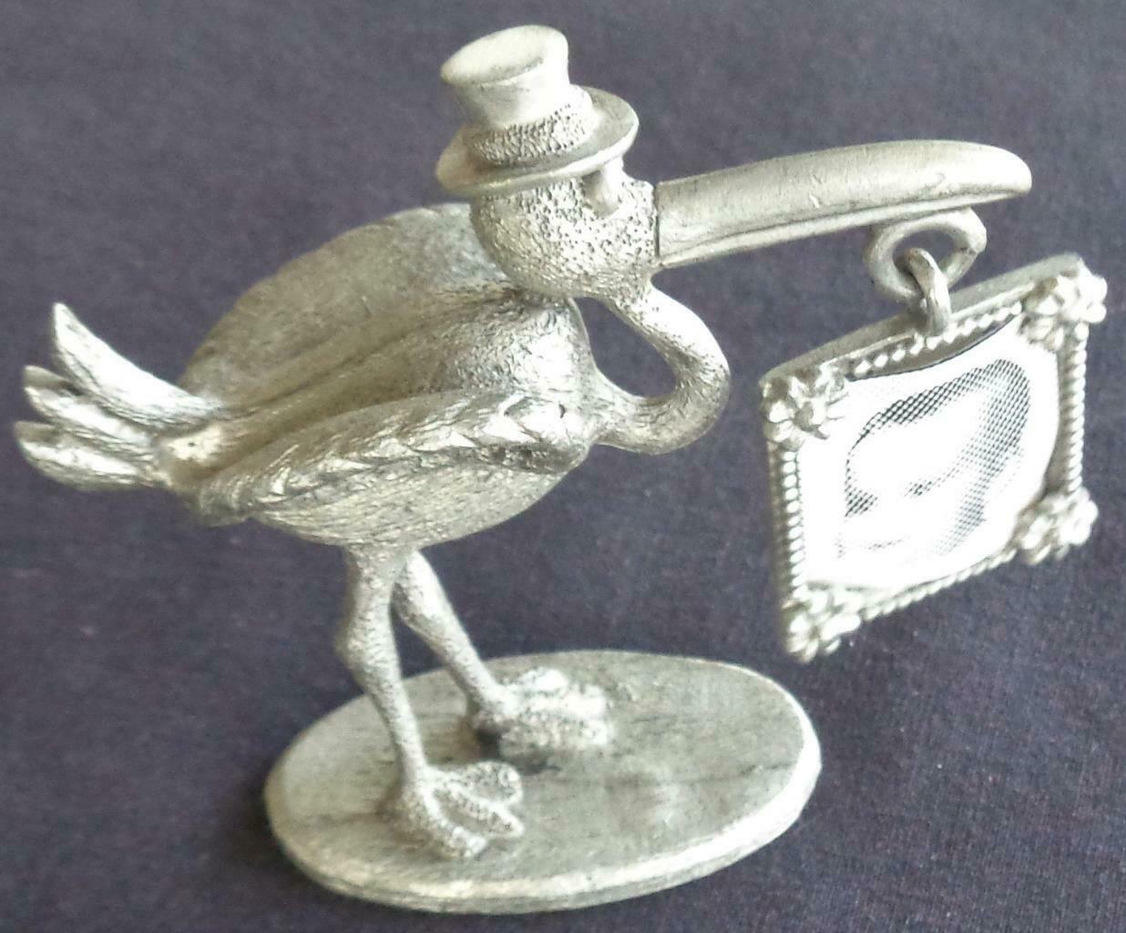Offered here is this Vintage Metal Spoonliques Inc. Stork Collectible Figurine. It is in particularly good condition and is made to put a tiny photo of the baby in the frame. There is no glass or cover to the frame. It is made of metal, most likely pewter, and has a brushed nickel finish. It is 2.25” tall, 2.75” from bundle to tail, and 1.5” by .75” in diameter at the base, and the photo size is about 1” square. It is an unbelievably cute little figurine and would be a wonderful “welcome baby” collectible gift for new parents to commemorate the birth of their baby. It is extremely cute!