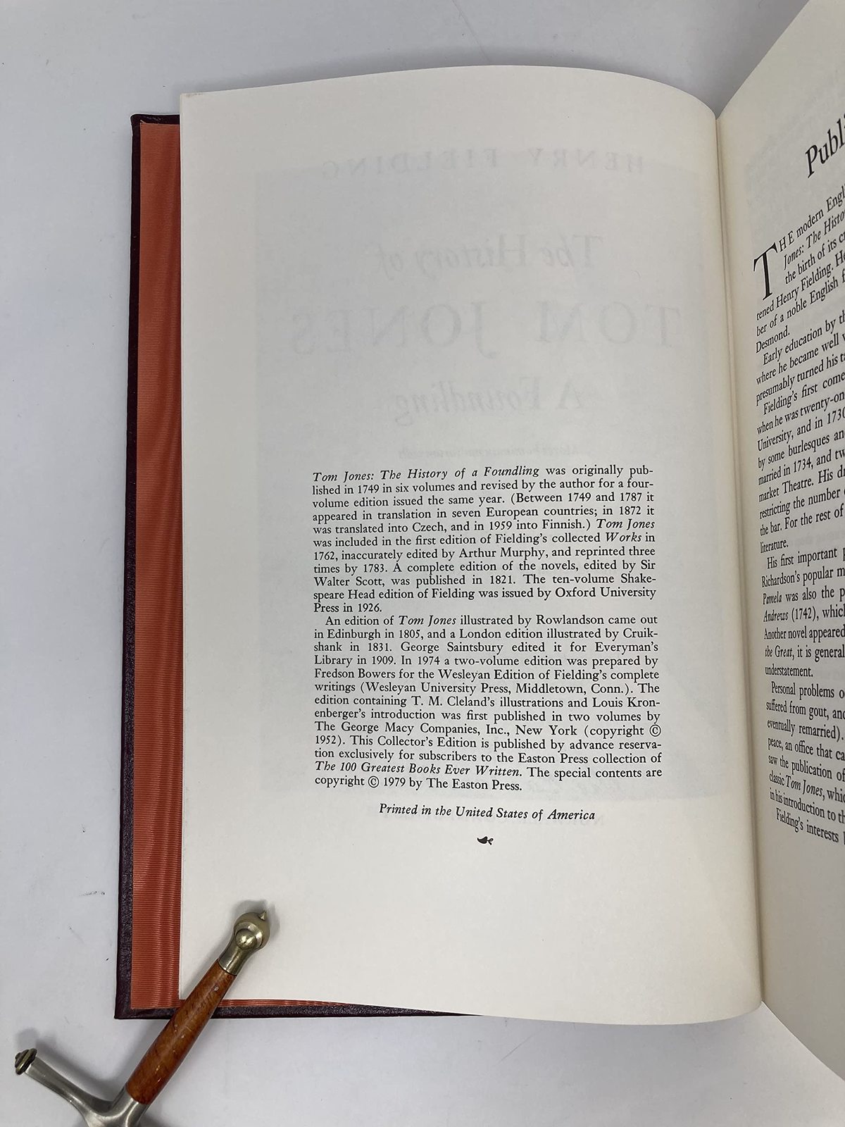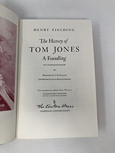Product description: Tom Jones. This is a book originally sold by The Easton Press, 47 Richards Avenue, Norwalk, CT 06857 as part of its "100 Greatest Books Ever Written Collector's Edition" collection which then evolved into "The Greatest Books Ever Written" collection. Many of the books carry a 1979 copyright but may have been printed in different years with different cover art. This is a leather-bound volume featuring 22kt gold accents, illustrations, moire fabric endsheets, gilded page ends, and a satin-ribbon page marker. The History of Tom Jones, a Foundling, often known simply as Tom Jones, is a comic novel by English playwright and novelist Henry Fielding. It was first published in 1749 in London. The main characters are: Master Thomas "Tom" Jones, a bastard and Squire Allworthy's ward; Miss Sophia "Sophy" Western , Western's only daughter, the model of virtue, beauty and all good qualities; Master William Blifil, the son of Captain Blifil and Bridget; a hypocrite and Tom Jones's rival; Squire Allworthy, Squire Western; Miss Bridget Allworthy (later Mrs Blifil); Allworthy's sister and Lady Bellaston.