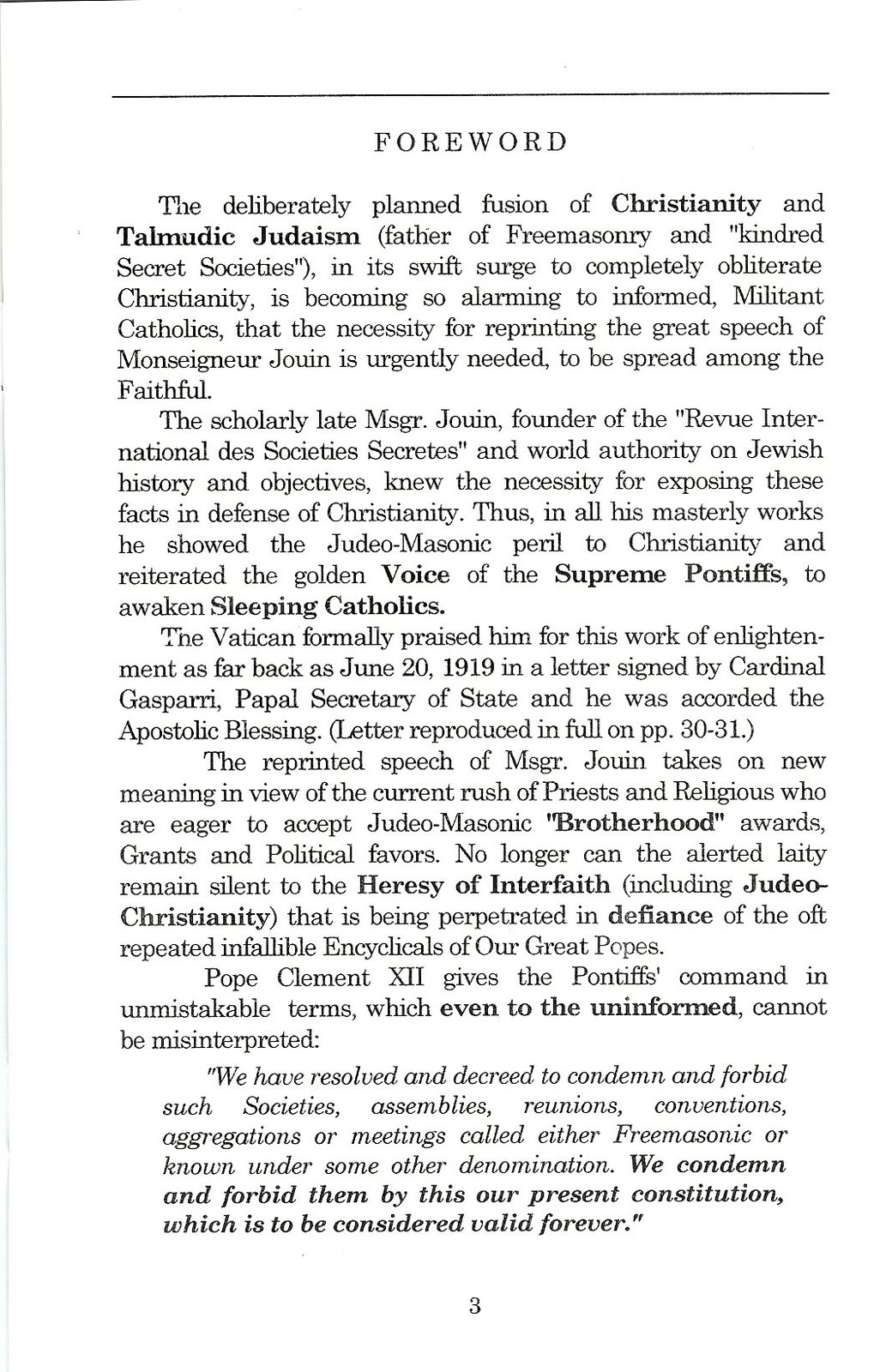Product description: Speech made by the late Monseigneur Jouin December 8, 1930. Papacy And Freemasonry, those are the two powers active throughout the world and each is seeking to dominate it. Either Roman Catholicism will lift us up again to the level of Christian Civilization or else Judeo-Masonry will drag us down the path of barbarism and decadent paganism. the deliberately planned fusion of Christianity and Talmudic Judaism in its swift surge to completely obliterate Christianity, is becoming so alarming to informed, Militant Catholics, that the necessity for reprinting the great speech of Monseigneur Jouin is urgently needed, to be spread among the faithful. the scholarly late Msgr. Jouin, world authority on Jewish history and objectives, knew the necessity for exposing these facts in defense of Christianity. Thus, in all his masterly works, he showed the Judeo-Masonic peril to Christianity and reiterated the golden voice of the Supreme Pontiffs, to awaken sleeping Catholics