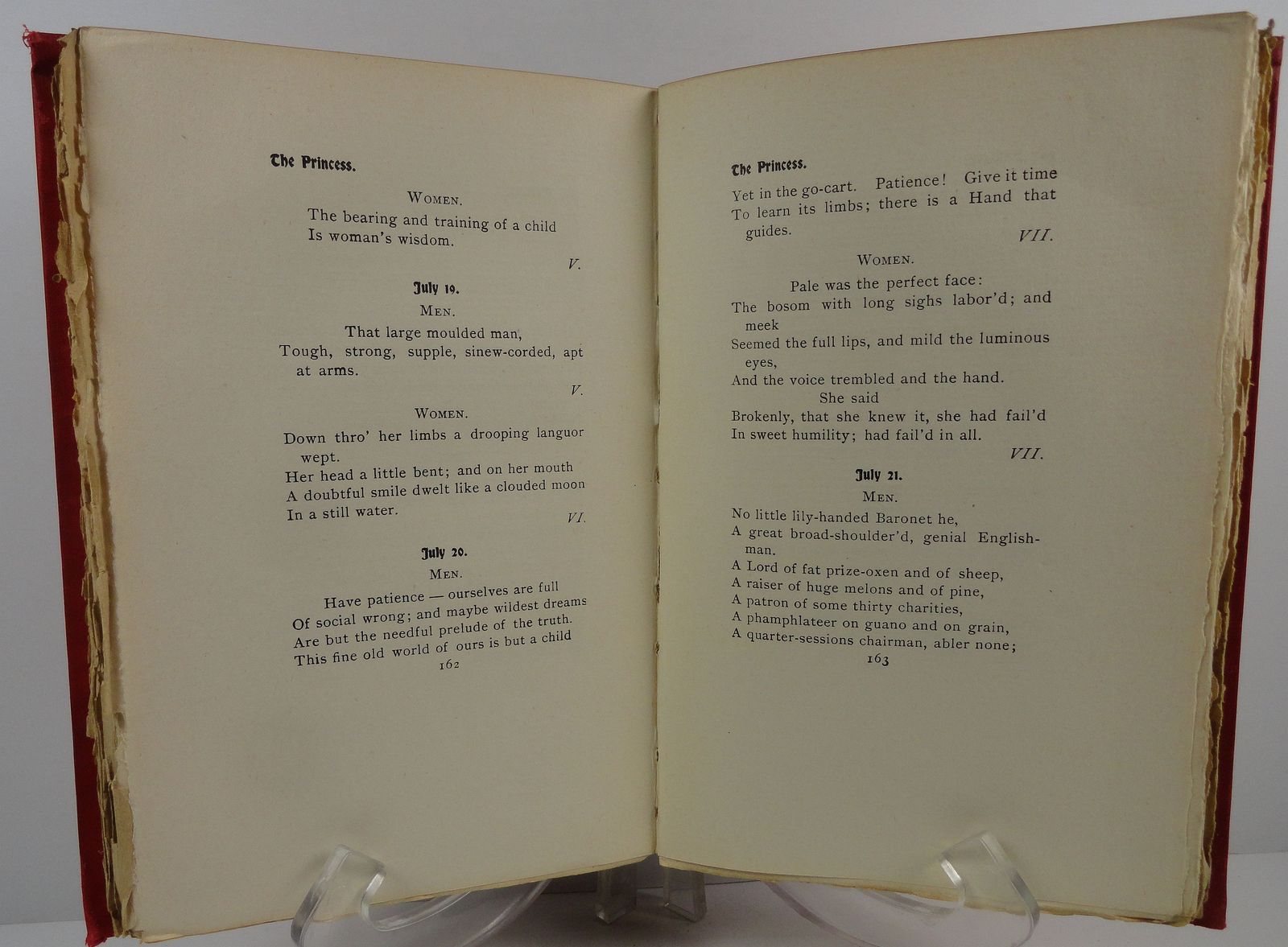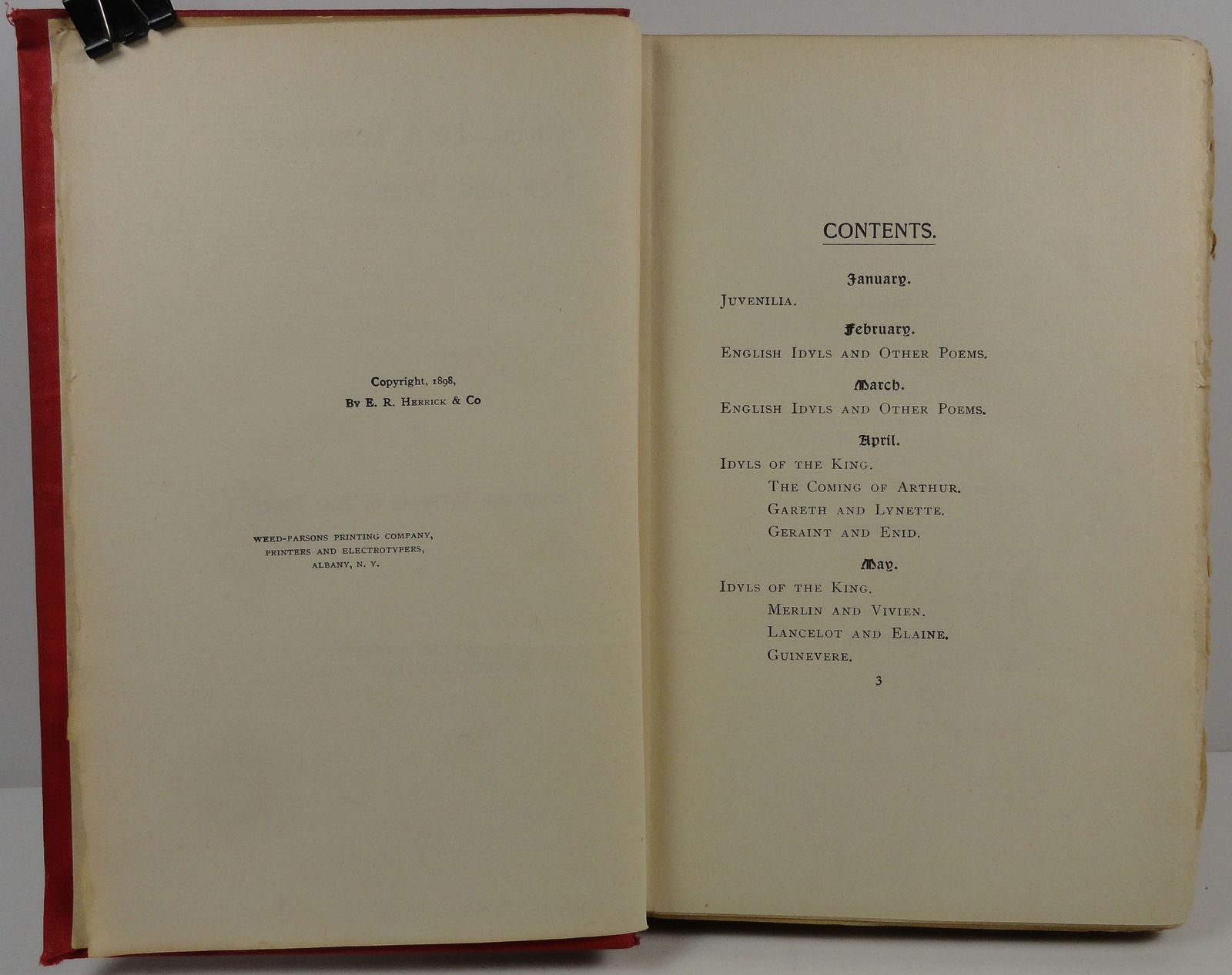 Contents: Jan.-Juvenilia, Feb.-English Idyls and Other Poems, Mar.-English Idyls and Other Poems, Apr.-Idyls of the King, May- Idyls of the King, June- The Holy Grail, In Memoriam, July- The Princess, Aug.-Maud, Harold, Sept.-Queen Mary, Oct.- The Foresters, Nov.- Becket, The Cup, The Falcon, Dec.-Miscellaneous .14 (#0000423)