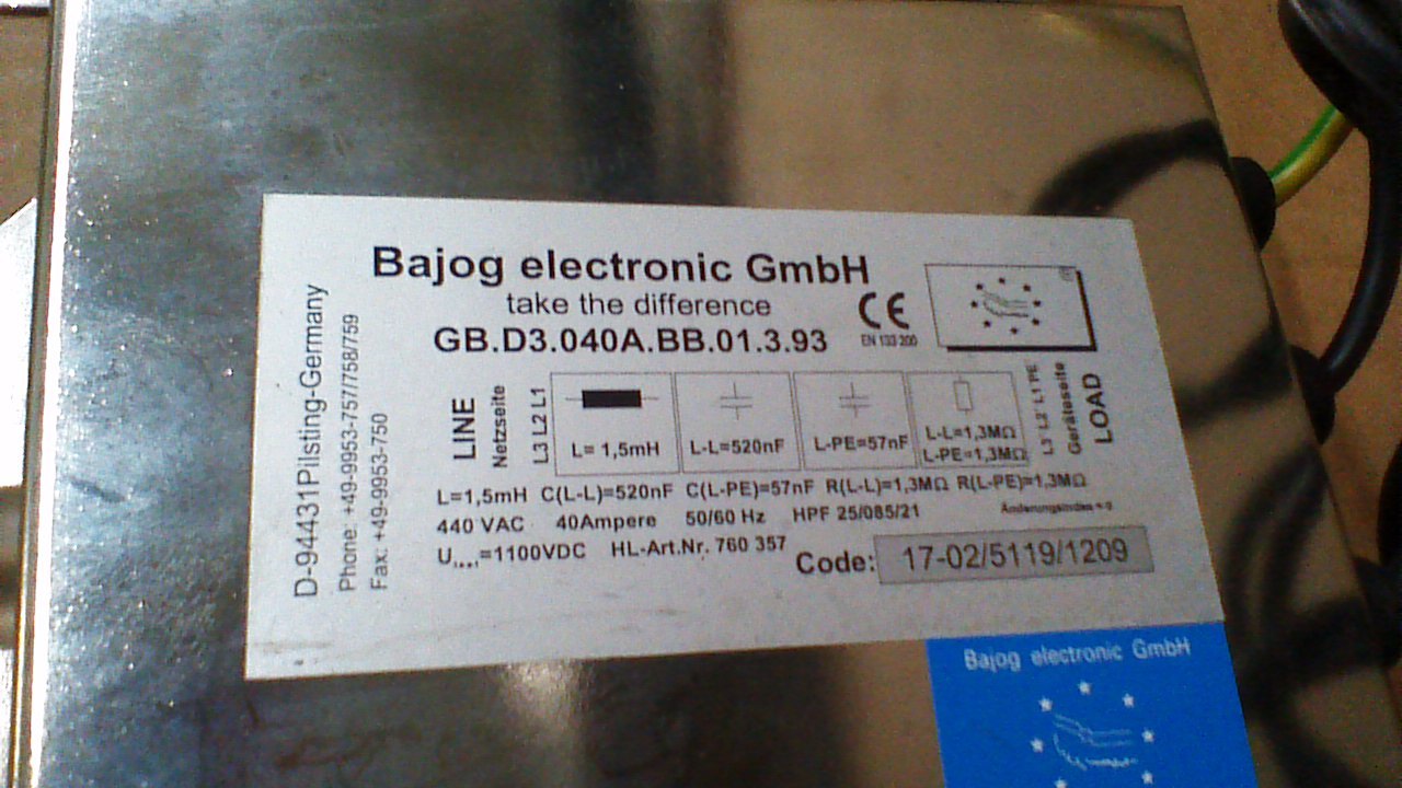 (3) BAJOG ELECTRONIC GB.D3.040A.BB.01.3.93 MAINS LINE FILTERS /440VAC 40AMPS MAX