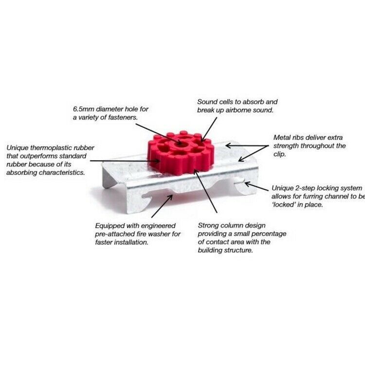 The unique sound cell design and the strong column design of the A237R clip eliminates structure borne vibrations transferring into the body of the sound isolation clip leaving a small fraction of contact surface area between the clip and the structure the clip is fastened to. This aids in absorbing and breaking up airborne sound at its transfer point. By locking to place on standard furring channels, A237R clips create a ?floating wall or ceiling? that creates resiliency and breaks sound waves. Resilmount clips isolate wall and ceiling systems from the building structure resulting in premium acoustic control. Because of its unique natural absorbing characteristics Resilmount?s patented thermoplastic rubber outperforms standard rubber.