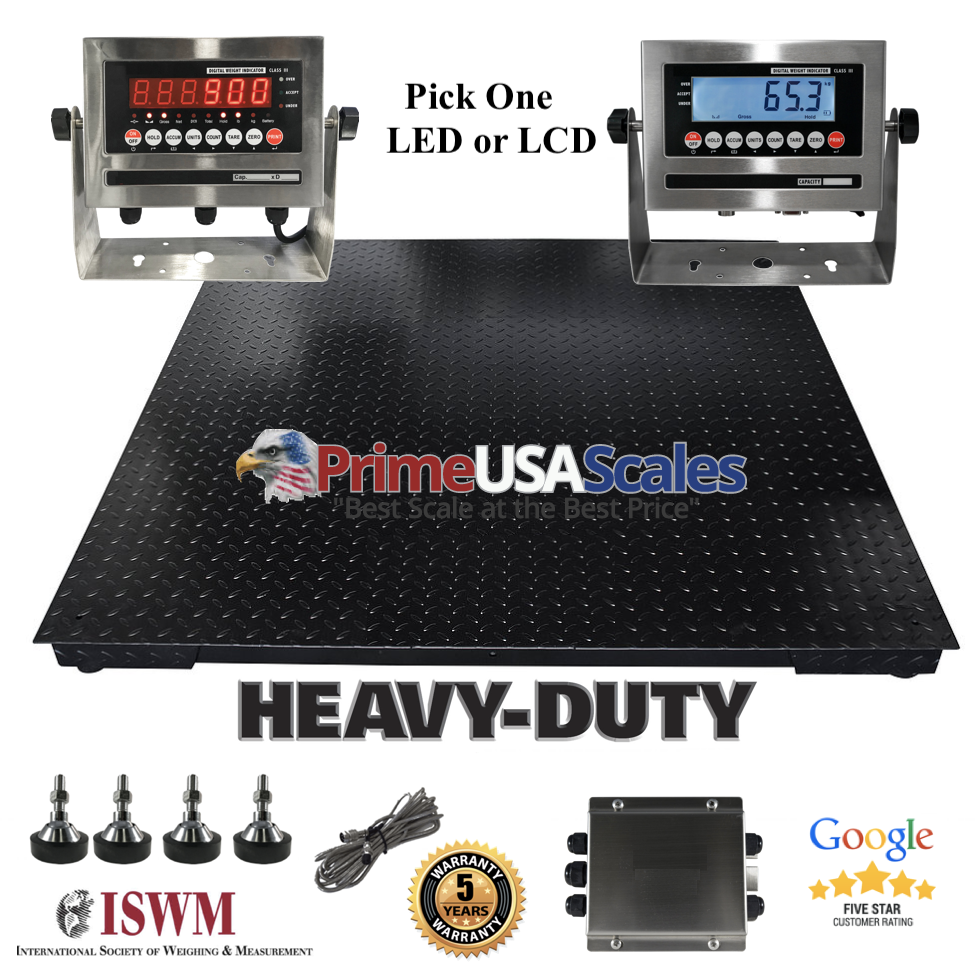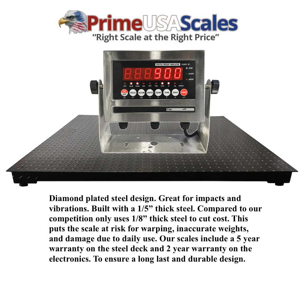 #65279; Prime USA Scales offers our heavy duty PS-4848SSIN (48" x 48") floor scale for shipping, warehouse weighing, or other weighing needs. The PS-4848SSIN has a stainless steel indicator with a diamond plated steel deck. Great for weighing drums, pallets, shipping use, weighing large items, and for accurate measurements. Our high quality indicator is smart ready that allows the user to easily connect to a printer, scoreboard display, or software with the included RS-232 port. Prime digital Floor Scale is ideal for weighing incoming and outgoing freight. Our Prime floor series arrives at your door completely calibrated and ready to weigh. We include 5 year warranty on the steel deck of the scale and a 2 year warranty on the electronics. FREE SHIPPING: applies going to a business address with forklift or loading dock. Shipping to a residential, farm address, and lift gate service is an additional fee. Indicator Features: ---Stainless Steel casing ---AC adapter included (Battery is optional) ---Multiple weighing units: (lb/kg); (g/oz/lb:oz) available on LCD only ---Gross/Tare/Pre-Set Tare/Zero ---Multiple Hold functions ---Count weighing ---Accumulation weighing ---Overload / Underload alarm ---Power saving mode ---Automatic date and time update ---Ability to modify gravity based on ---Different geographical locations ---100% manual zero range setting ---Automatic error warning alarm ---Splash proof keyboard and display ---Connects to a remote display ---Connects to multiple printers ---NTEP approved for 5,000 divisions ---Displays up to 50,000 graduations ---1 rdquo; LED or LCD display with backlight ---Mounting bracket and Hardware (included) ---Operates on 110V AC adapter (included) ---Full Duplex RS-232 Serial Port ---Drives up to 6 350 Omega; load cells Product features: ---Four high quality alloy feet ---Provides accurate weighing in full capacity range ---150% overload protection #8232; ---Diamond steel deck plate and powder coated ---High quality LED indicator with Stainless Steel Enclosure ---Optional Rechargeable battery up to 80 hours (must message on check-out) ---LB or KG selectable ---Tare function ---Rechargeable battery with charger included ---15 foot cable for indicator ---1,000 lb x 0.2 lb Capacity We strive for 100% Feedback! WHY BUY FROM US? We offer a quality built product at a reasonable price. We specialize in scales and nothing else. We offer sales, service, and calibration in the largest cities throughout the United States. We stand behind our products and have a knowledgeable staff ready to help with any questions. We manufacture American made products, build custom scales, and offer only the best quality. #65279;
