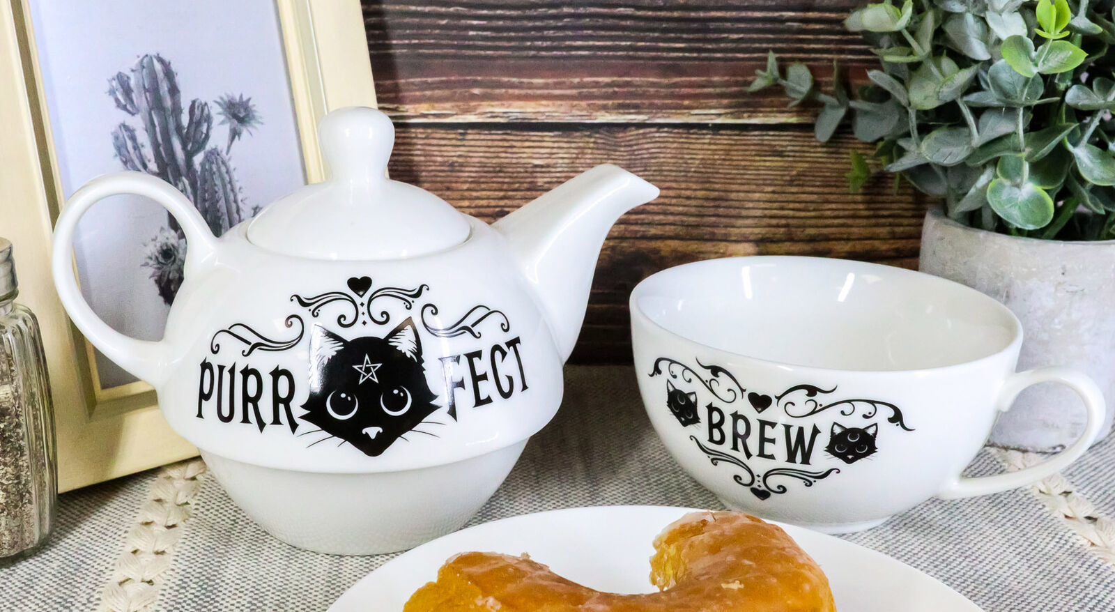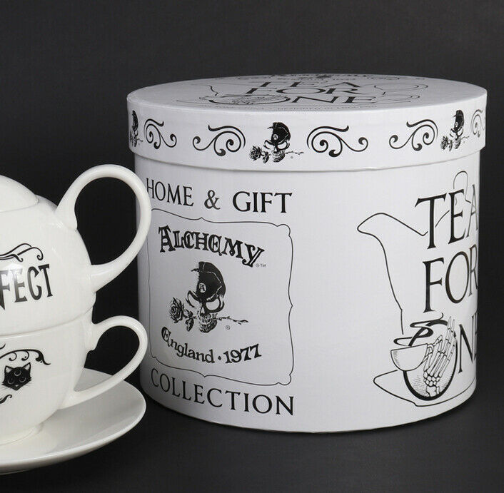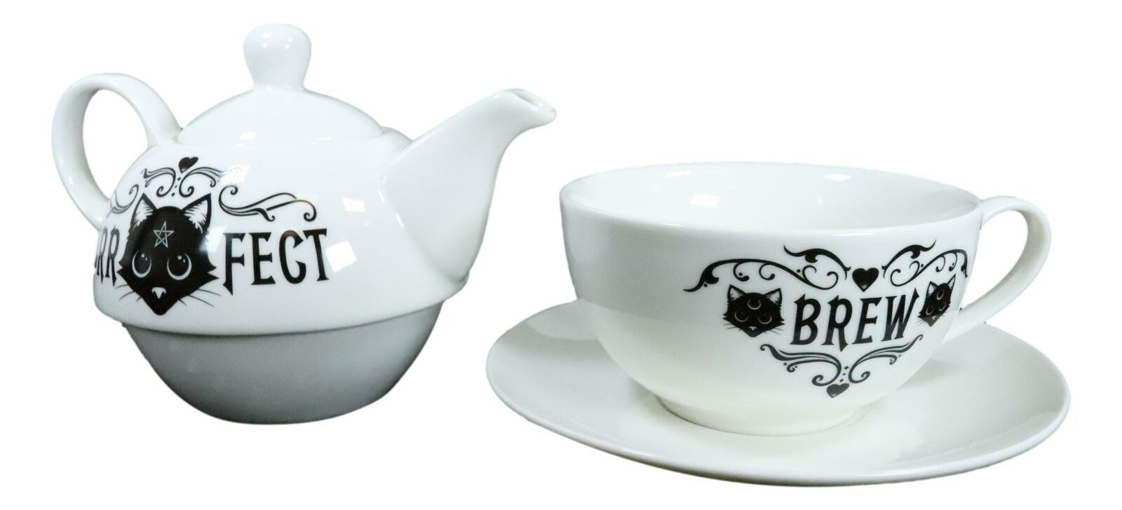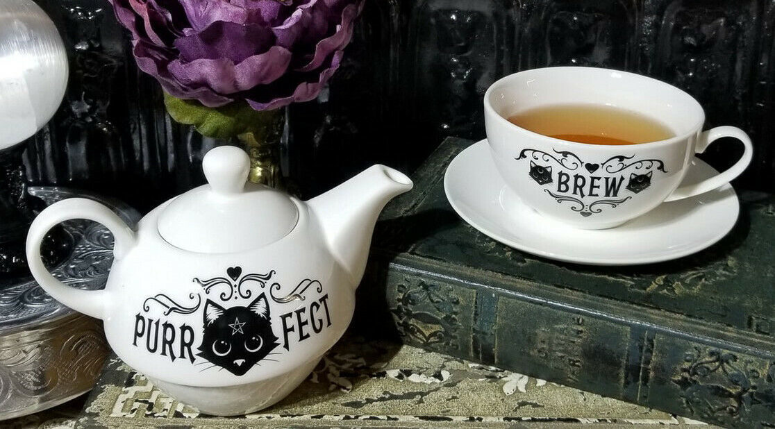 โข Serve your favorite brews with fantasy spooky style using this teapot set for one. Designed with the Purr Fect Brew theme, you will find magical icons and of course a cat with pentagram star on its forehead on both sides of the drinkware. The teapot set comes packed in a unique sturdy cylindrical printed packaging box as pictured.