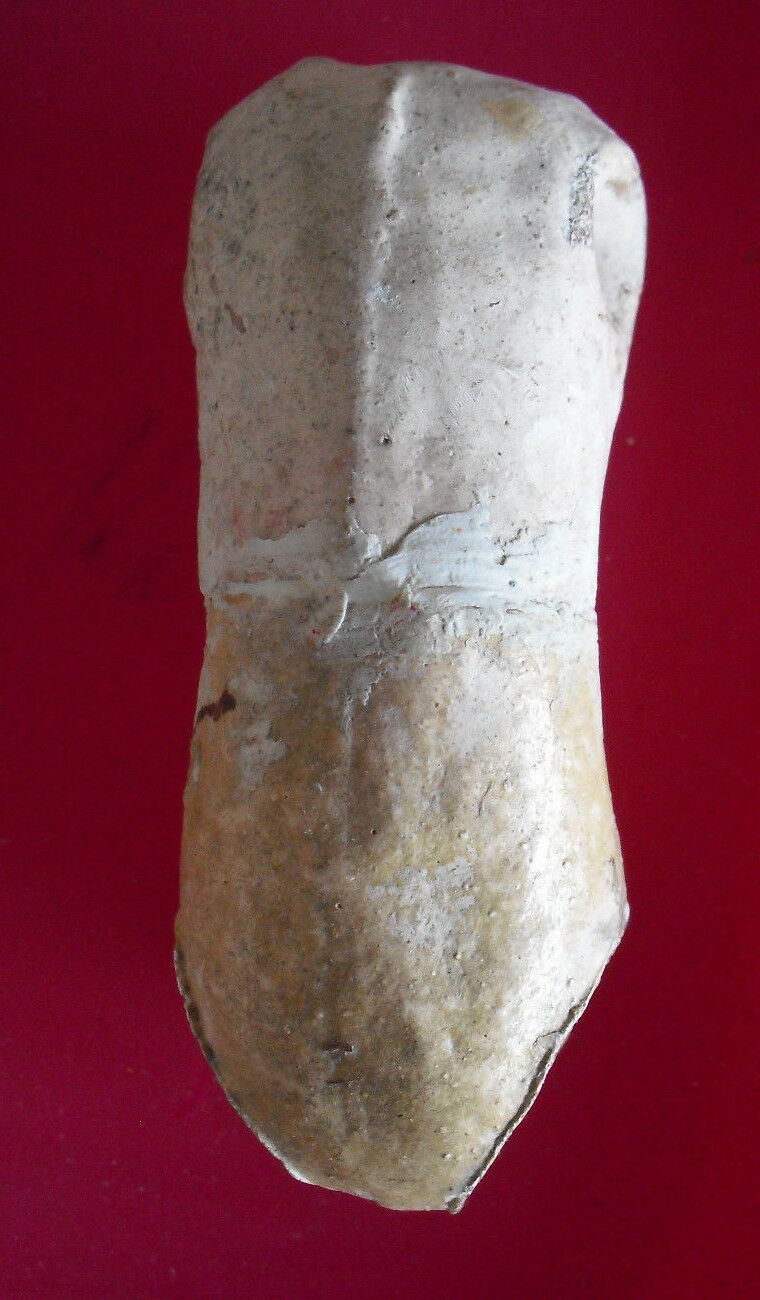 Very odd, antique, small doll torso body in the pictures. It's a crude, solid composition body, thin flesh finish in the pictures. Strange old one in very good shape with light general wear. 3 3/4 inches tall.