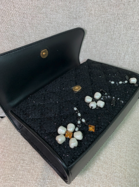 This bag is made of black tweed and genuine leather.