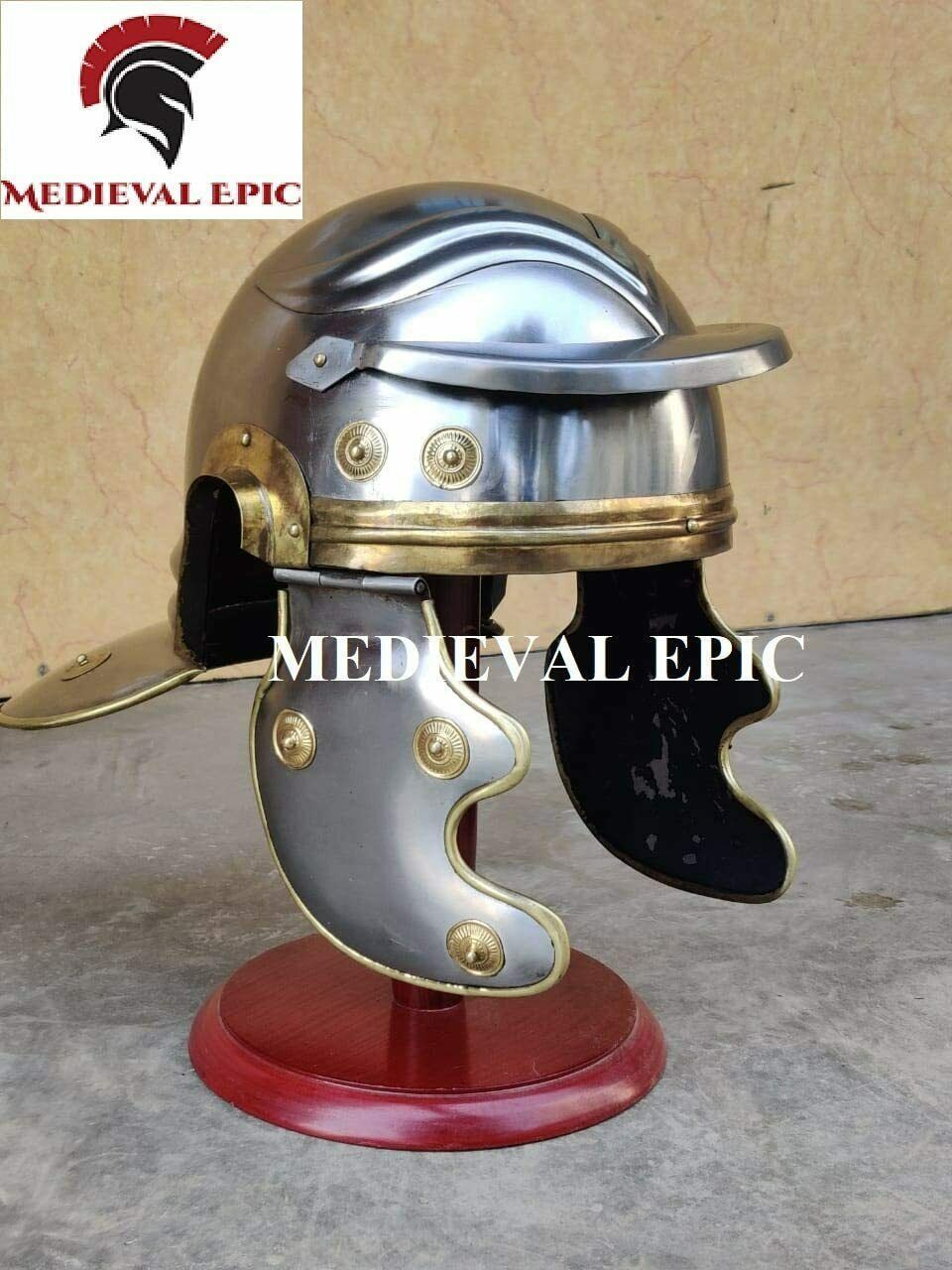 ANCIENT ARMOR MEDIEVAL ROMAN CENTURION HELMET SIZE: ADULT SIZE WEARABLE This Roman Officer helmet is handmade from 18 gauge steel. The costume helmet has brass accents. Slight differences in size and finish are possible. The helmet is full sized and wearable for costume purposes