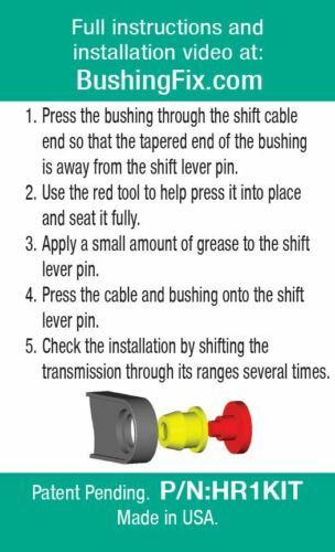 Dodge Caliber transfer case shift cable kit (US patent #10,619,723 and #10,215,273) allows you to quickly and easily repair your 4X4 shift selector cable by replacing the bushing. The patented coupling and custom molded replacement bushing ensures a quality repair with ease. A professional can perform this repair in under 5 minutes, average time for a non-professional is less than 10 minutes. This bushing is made from a material that was designed to outlast the factory bushing and includes everything needed to install. Bushing Fix HR1KIT- Transmission Shift Cable Bushing Repair Kit ; (US Patent # 10,215,273 and US Patent # 10,619,723).