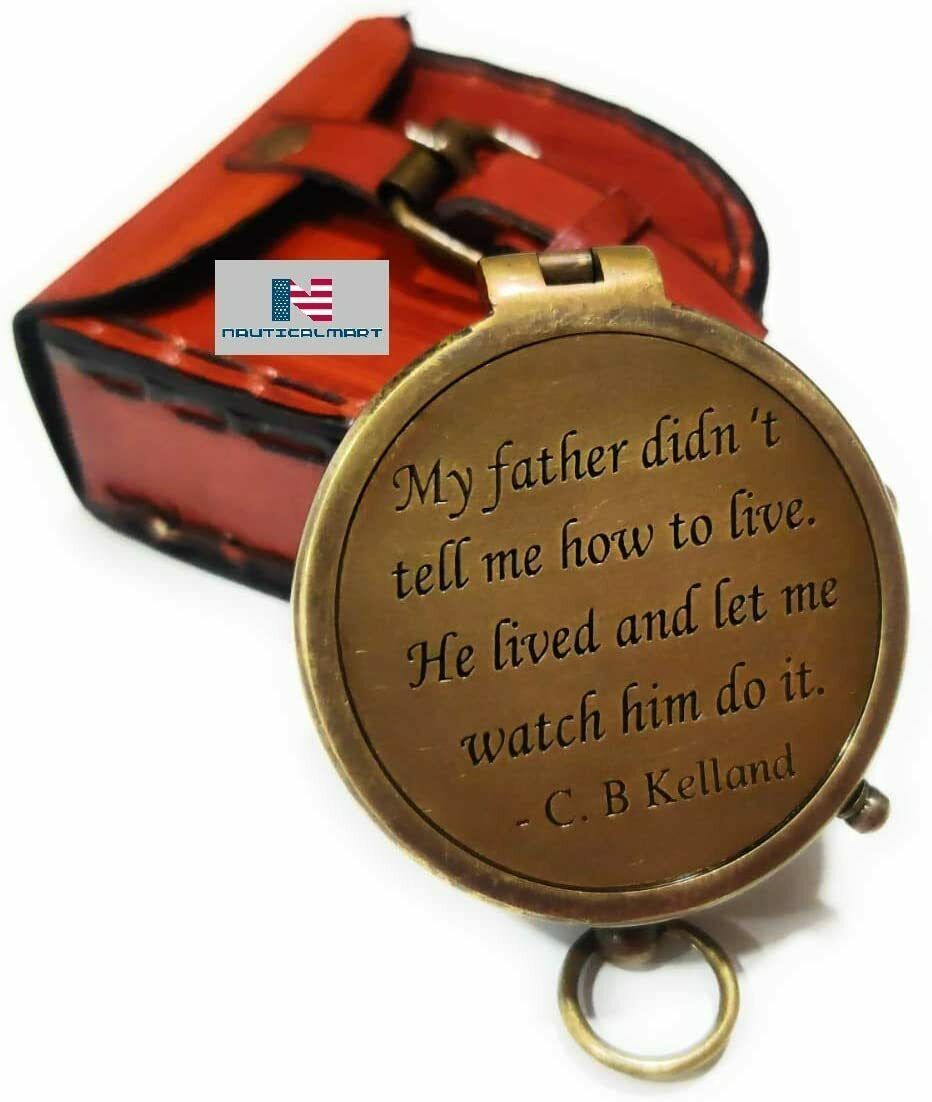 Personalized Gift Compass: Brass Engraved Compass with Stamped Leather case. Solid Brass Compass "My Father Didn’t Tell Me How To Live, He Lived And Let Me Watch Him Do It ". Under the glass cover is beautiful, the high-quality jewelled compass needle settles to the North very quickly for timely and accurate readings. It has a small lever on the side of the compass that operates a needle lift mechanism to protect the compass bearing. Gift for someone you love. Engraved message of the Compass
