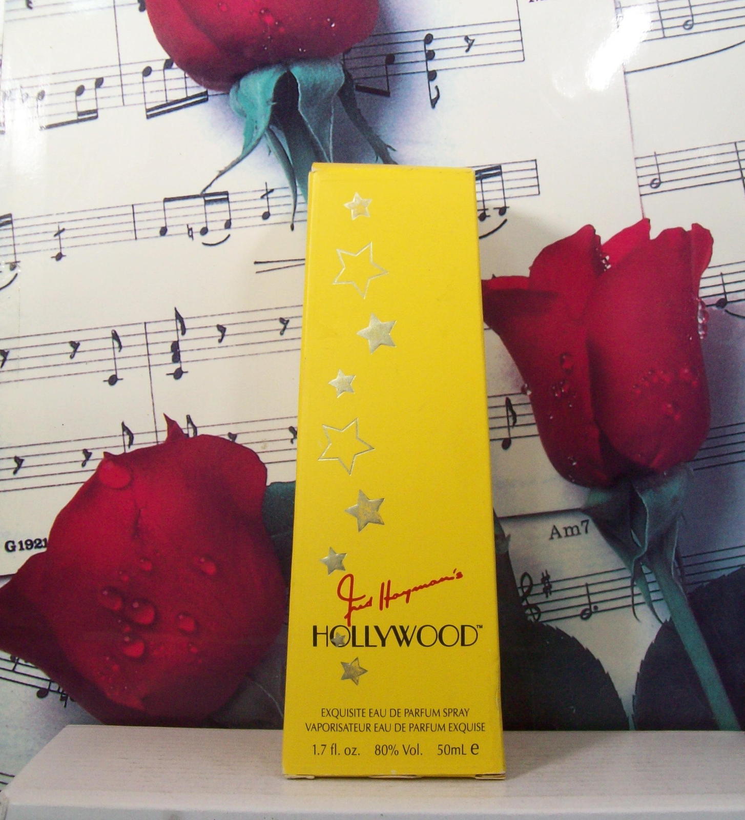 Hollywood Perfume by Fred Hayman, White florals abound in Hollywood for women, launched in 1988. Top notes open this perfume with aldehydes, peach, green leaves, and mandarin orange. Middle notes of jasmine, tuberose, ylang-ylang, mimosa, and rose sweeten the floral middle, and civet, musk, sandalwood, amber, and gardenia provide an animalic base. Recommended for daytime wear, it is a warm, sharp scent that enhances natural femininity.