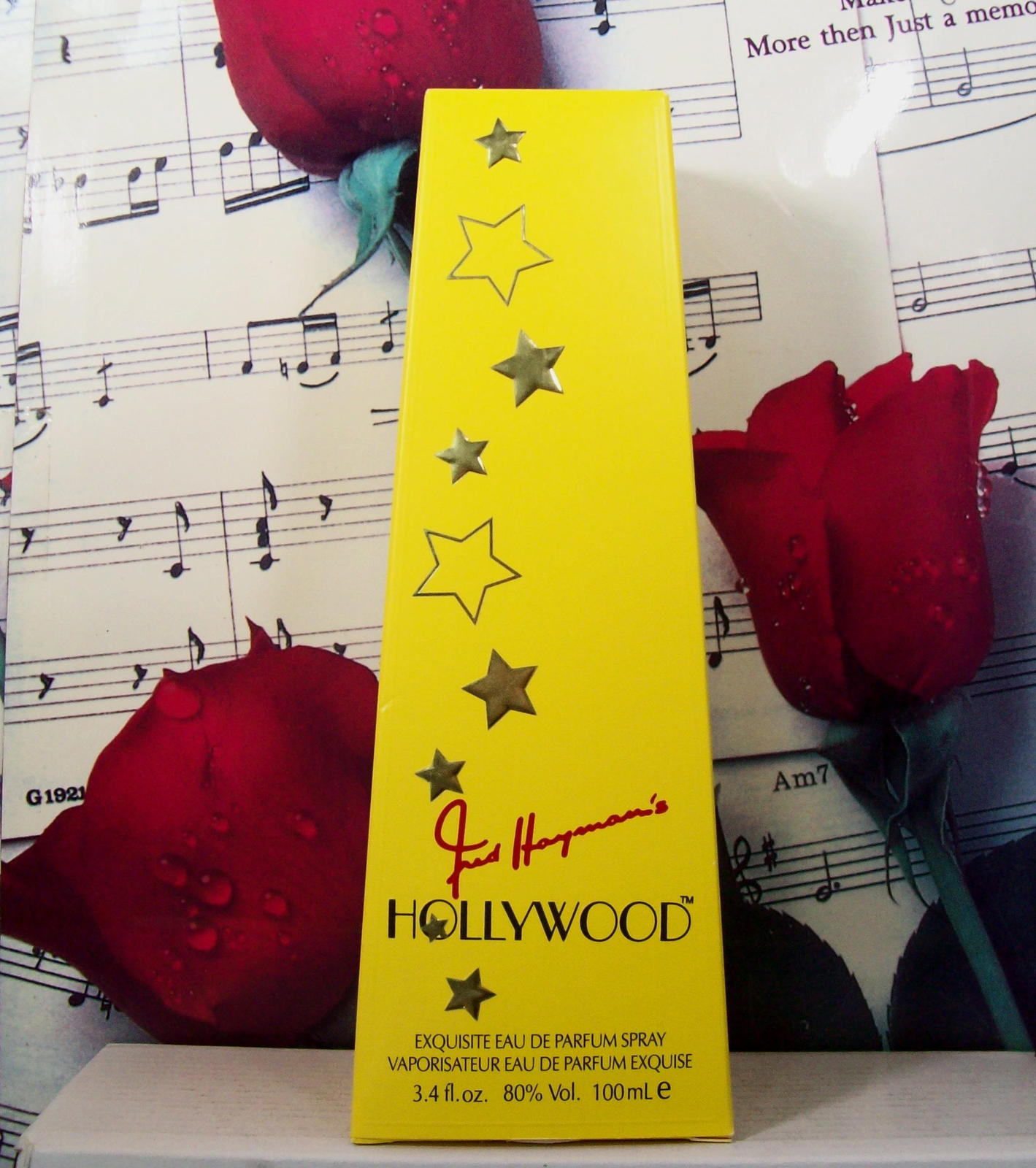 Hollywood Perfume by Fred Hayman, White florals abound in Hollywood for women, launched in 1988. Top notes open this perfume with aldehydes, peach, green leaves, and mandarin orange. Middle notes of jasmine, tuberose, ylang-ylang, mimosa, and rose sweeten the floral middle, and civet, musk, sandalwood, amber, and gardenia provide an animalic base. Recommended for daytime wear, it is a warm, sharp scent that enhances natural femininity.