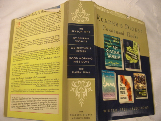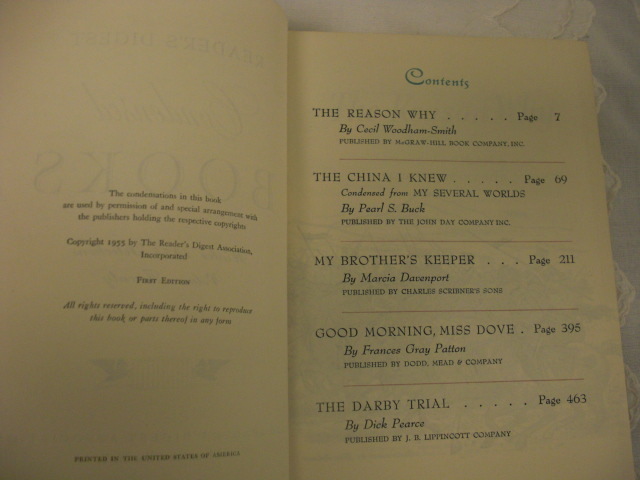 Reader's Digest Condensed Books; Winter 1955, Volume 20: The Reason Why / The China I Knew / My Brother's Keeper / Good Morning, Miss Dove / The Darby Trial: The Reason Why - Cecil Woodham-Smith, The China I Knew (My Several Worlds) - Pearl S. Buck, My Brother's Keeper - Marcia Davenport , Good Morning, Miss Dove - Frances Gray Patton and The Darby Trial - Dick Pearce.