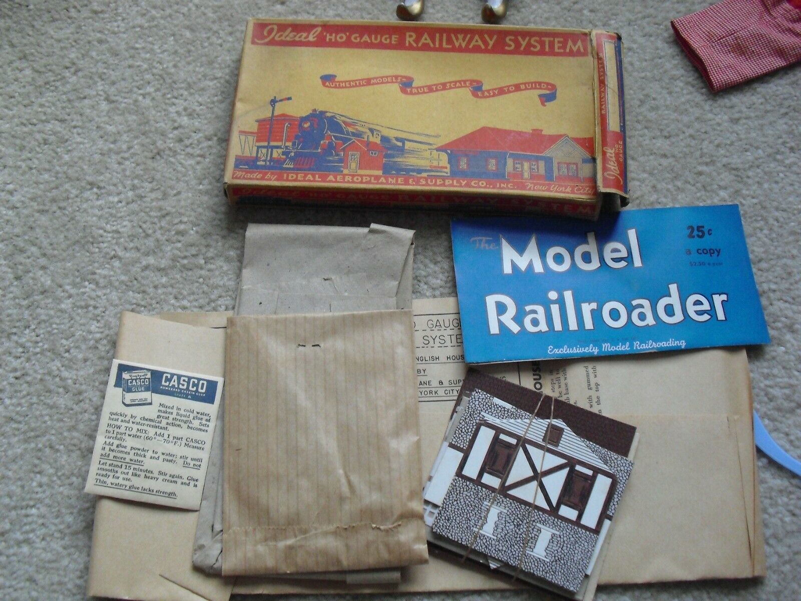 Unique, early HO scale kit, 1940s era, Ideal HO Scale kit in the box, never built. It's an Ideal HO Gauge Railway System building, an Old English House. Package is worn. Wood and cardboard pieces. Unused but box has tons of wear and old staining, pieces appear to be fine but the box has wear and is open so it may not be complete. Sold as shown. Zoom in for details.