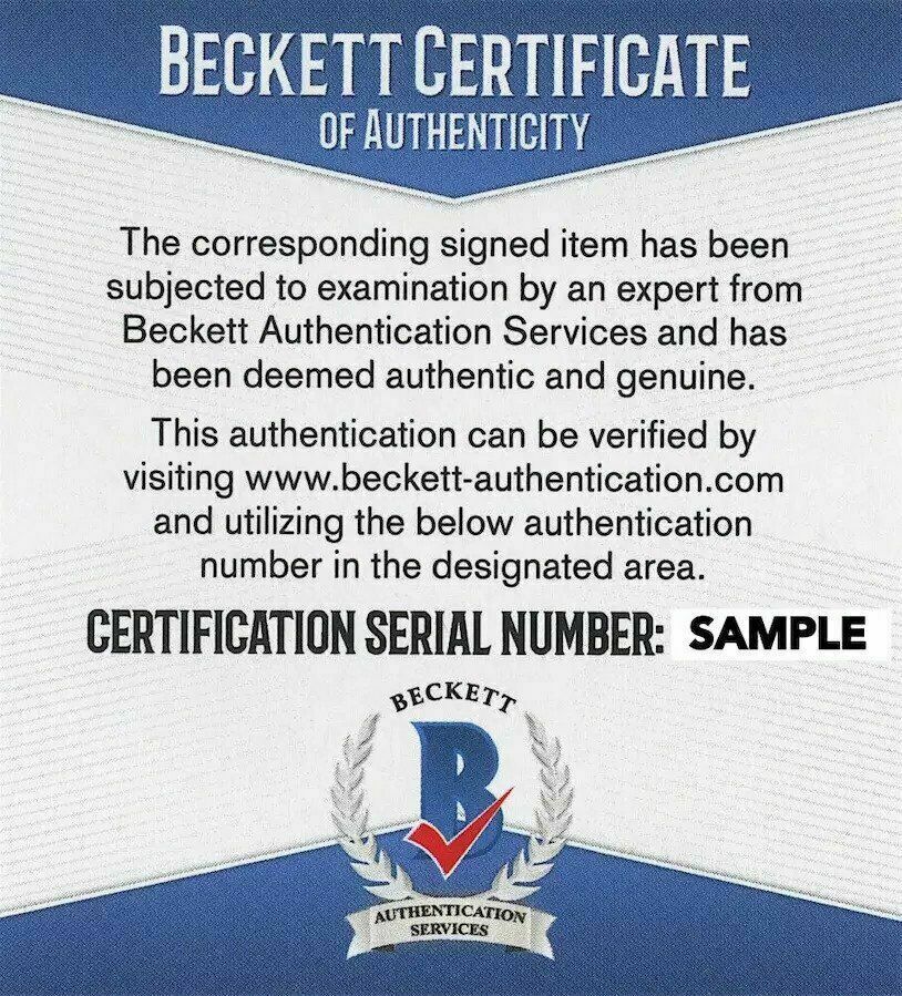 This autograph is certified authentic by Beckett Authentication Services (BAS), one of the largest most reputable authenticators in the industry. This piece includes the BAS tamper-proof authentication sticker and identification card directly from them, which can also be accessed anytime/anywhere on their online database on their website. Note: This is a st