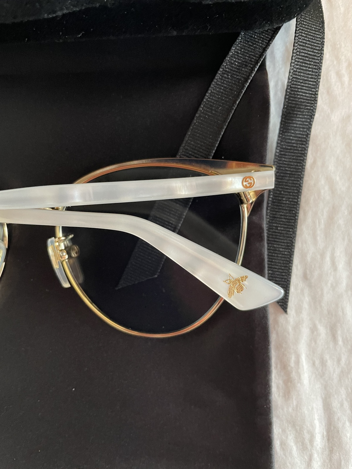White mother of pearl effect temples with GG logo and gold bee at the tips