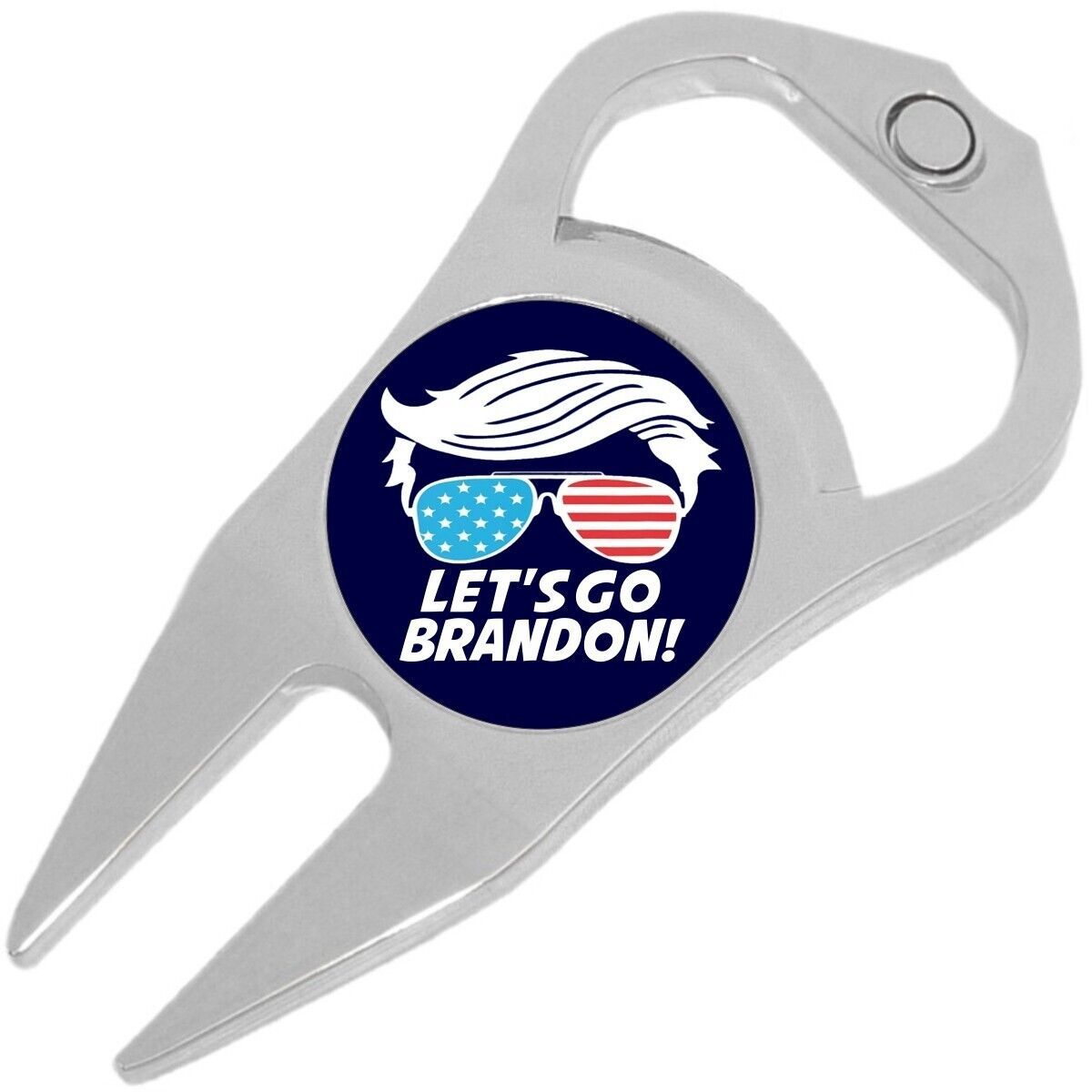 Lets Go Brandon Trump Hair Golf Ball Marker Divot Repair Tool Bottle Opener. This is an all-in one tool for the golf course. It features a ball marker with a high-quality unique image, a putting green repair tool, and a beer bottle opener. Included is a magnet to secure the ball marker to the tool. This item makes a great gift too!