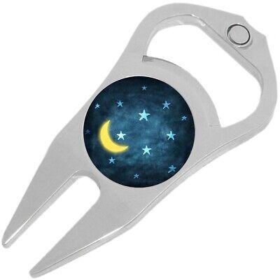 Moon and Stars Golf Ball Marker Divot Repair Tool Bottle Opener. This is an all-in one tool for the golf course. It features a ball marker with a high-quality unique image, a putting green repair tool, and a beer bottle opener. Included is a magnet to secure the ball marker to the tool. This item makes a great gift too!